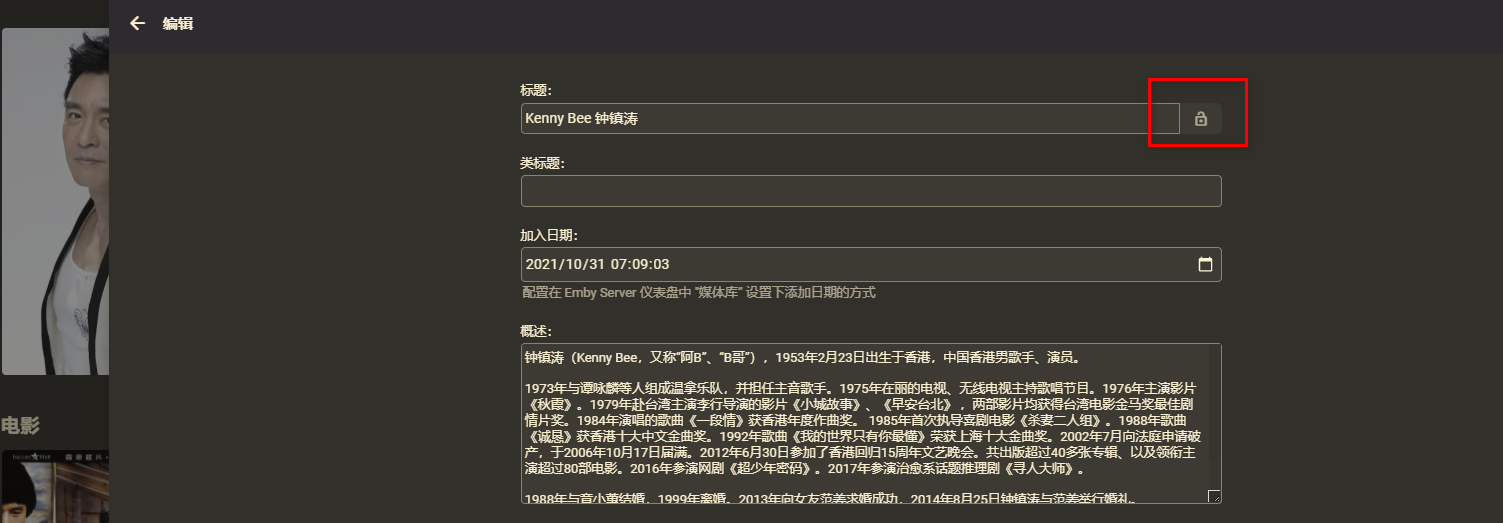 Joechung 5 Posted November 5, 2021 Author Posted November 5, 2021 10 minutes ago, GrimReaper said: hence <title> could be changed at will but it will not affect anything besides Display name, as Original Title would be retained? Sorry, I don’t quite understand what you mean here? I am doing any action now, refreshing the metadata, manually identifying, or refreshing the metadata for the entire movie. The original title of the character shows the same as I changed before, "Kenny Bee 钟镇涛" (without lock) I want to know if there is any way for EMBY to restore the original title to the actors by refreshing or deleting the information.