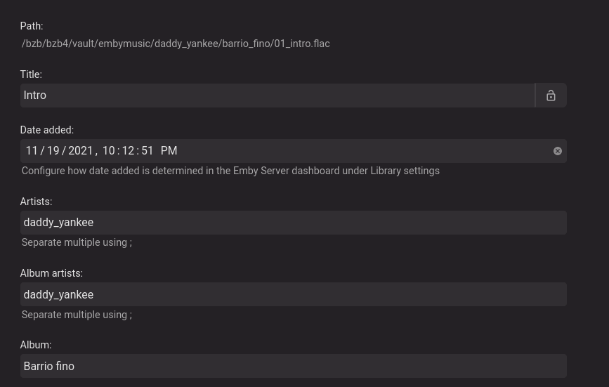 gbcox 13 Posted November 20, 2021 Author Posted November 20, 2021 (edited) I deleted the first music library and restarted emby to start from hopefully scratch. A little background, I'm investigating migrating over from Plex to emby. Yesterday I installed emby and am doing test by only migrating certain directories, so I can discover issues before I jump in. Not sure what you mean by specific examples. My system is linux, so all my directorys are in the artist_name format. So I have a upper level directory called emby_music which I add to the library. Within emby_music, the next layer is the artist_name, then the next layer is a folder for each individual album. I loaded several folders into emby: daddy_yankee, farruko, j_balvin, lucas_lucco, maluma, zz_top daddy_yankee and zz_top show incorrectly, j_balvin displays correct. You can see from the emby_artists.png how the names are incorrect. Then look at the track_daddy.png which shows when I played a track. Notice that emby is reporting daddy_yankee as artist and album artist. Then look at the tag display from picard, it clearly shows that the embedded tags for the file are Daddy Yankee for both artist and album artist. Here is what ffprobe says about the track: Input #0, flac, from '01_intro.flac': Metadata: DATE : 2005-05-17 track : 1 TITLE : Intro GENRE : Latin TOTALTRACKS : 23 ALBUM : Barrio fino ARTIST : Daddy Yankee CDDB : 5f10c017 ACOUSTID_ID : 65d2fc2a-4612-4567-8198-d4d98f714c52 MUSICBRAINZ_RELEASEGROUPID: 5fa20be8-ea07-31bd-a915-f12a3ab8495e ORIGINALDATE : 2004-06-13 ORIGINALYEAR : 2004 RELEASETYPE : album MUSICBRAINZ_ALBUMID: 0b0e84e9-a01f-41bc-bc5b-4d0322983076 ASIN : B0009WXGH8 MUSICBRAINZ_ALBUMARTISTID: 2f522f5c-111c-4ce8-8bd0-d82e97c227ad album_artist : Daddy Yankee ALBUMARTISTSORT : Daddy Yankee RELEASESTATUS : official LABEL : Polydor CATALOGNUMBER : 9883424 BARCODE : 0602498834244 SCRIPT : Latn RELEASECOUNTRY : GB TOTALDISCS : 1 disc : 1 MEDIA : CD MUSICBRAINZ_TRACKID: e1b50f74-02e1-407f-8ee6-82feb32769dd MUSICBRAINZ_ARTISTID: 2f522f5c-111c-4ce8-8bd0-d82e97c227ad ARTISTSORT : Daddy Yankee ARTISTS : Daddy Yankee MUSICBRAINZ_RELEASETRACKID: eb0d72b5-ab28-3808-a4f6-fea71bf39a5d TRACKTOTAL : 23 DISCTOTAL : 1 Duration: 00:01:19.36, start: 0.000000, bitrate: 841 kb/s Stream #0:0: Audio: flac, 44100 Hz, stereo, s16 When scanning this directory with Plex, no issues whatsoever. It displays everything correctly - and weirdly enough J Balvin is working correctly. Here is the url for Daddy Yankee on musicbrainz: https://musicbrainz.org/artist/2f522f5c-111c-4ce8-8bd0-d82e97c227ad The tag matches what emby says it is using as it's metadata (as I reported in the initial post), yet something isn't working correctly. As I mentioned, I'm coming from Plexland so not familiar with where you folks store all the different information. If you tell me where to look, hopefully we can solve this. It's weird, and I really am puzzled how this is happening out of the gate with a vanilla install. Thanks much! Edited November 20, 2021 by gbcox