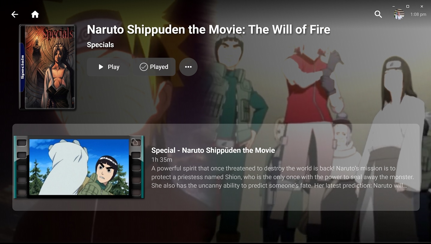 GrimReaper 4740 Posted December 22, 2021 Posted December 22, 2021 (edited) Something is off with your library setup, your screen shows "Naruto Shippuden the Movie: The Will of fire" as a title, not as a "Naruto Shippuden" TV Show as it should, and it also lacks Shuffle button that would show if it was Specials season. What library type you have there? What paths you entered? Edited December 22, 2021 by GrimReaper Typo