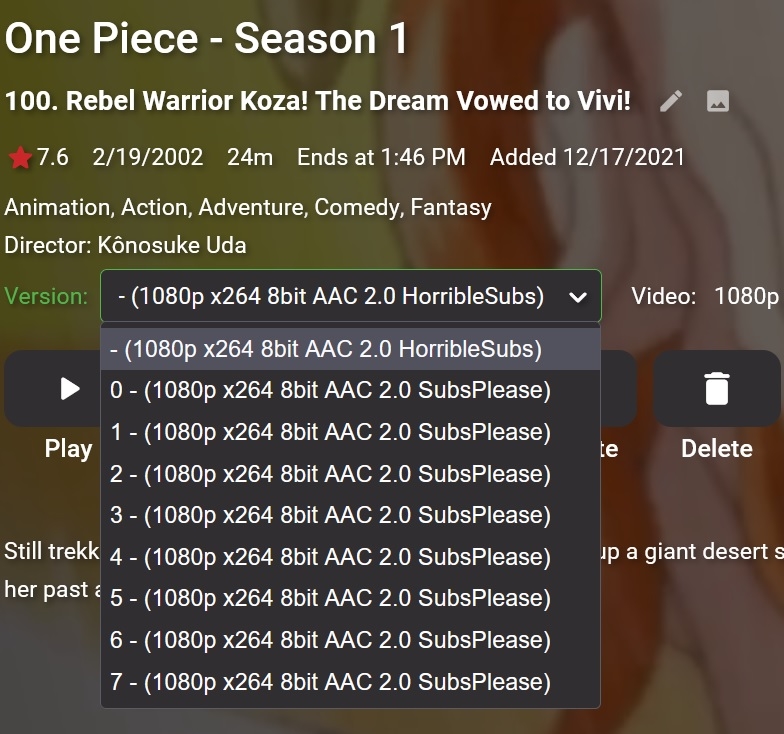 miniliQuid 94 Posted January 28, 2022 Author Posted January 28, 2022 As shown below, without titles things work fine as was suggested (without the title there are no title numbers to be confused with the episode number). However as soon as a show (tested it on another one besides one piece as well to be sure) goes above 999, the system still gets broken. But in this case it just adds all of the 1000 and higher episodes as versions under episode 100. This time however it is without titles in the file name as shown in the images below.