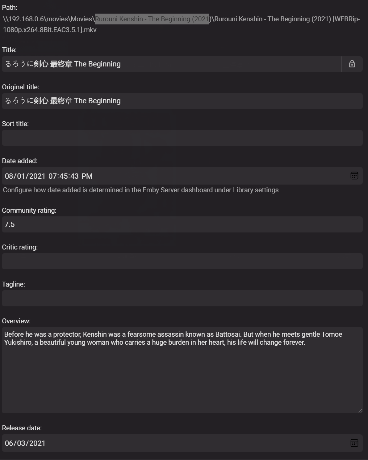 embyzone 5 Posted November 22, 2021 Author Posted November 22, 2021 (edited) Here is one from this year Rurouni Kenshin - The Beginning (2021) [WEBRip-1080p.x264.8Bit.EAC3.5.1].nfo Edited November 22, 2021 by embyzone