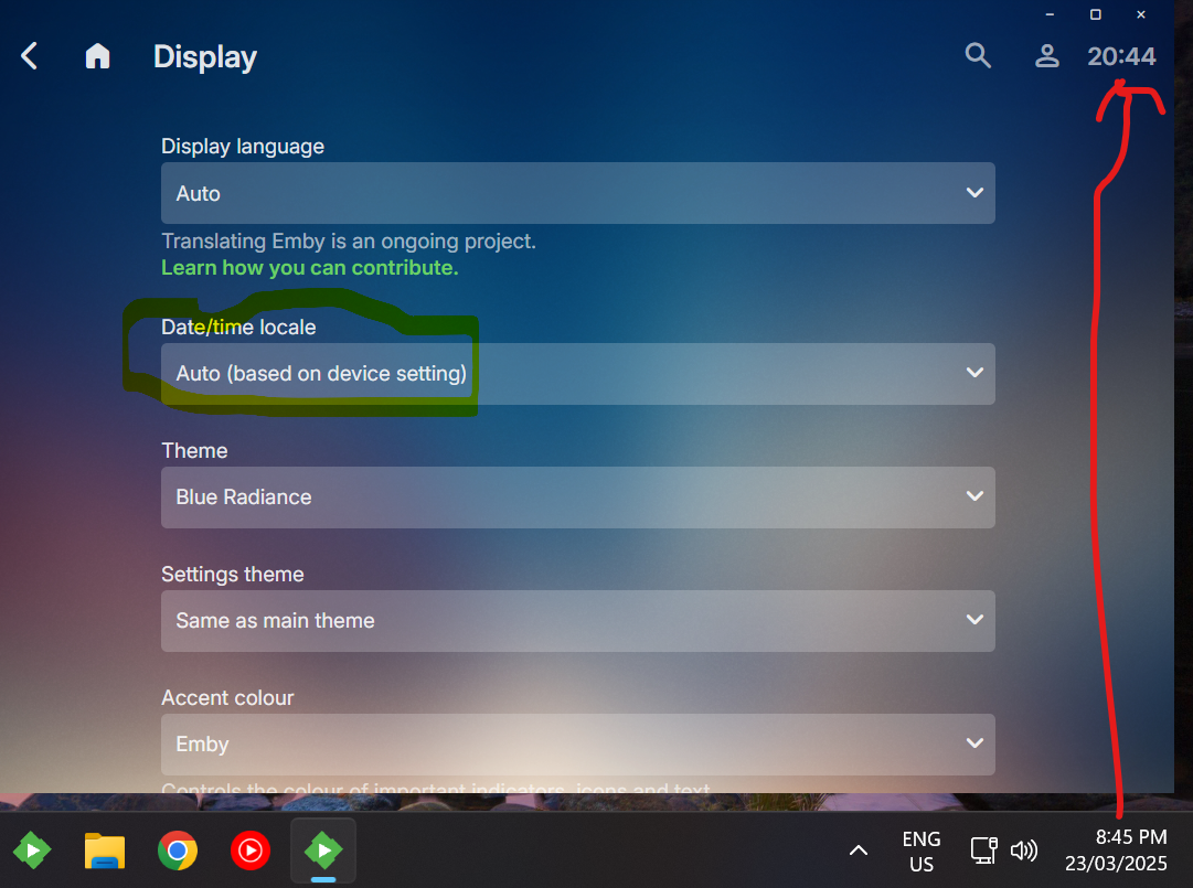 Mbedford 7 Posted March 23, 2025 Author Posted March 23, 2025 (edited) Its been a few years, is Emby theater ever going to show time in the correct system set format? In this example 12hr. Currently Emby Theatre for Windows 3.0.21 running on Windows 11 Version 10.0.26100.3476. Locale Australia, GMT+10. Have tried setting the Date/time locale to the other 21 English locales too. Edited March 23, 2025 by Mbedford