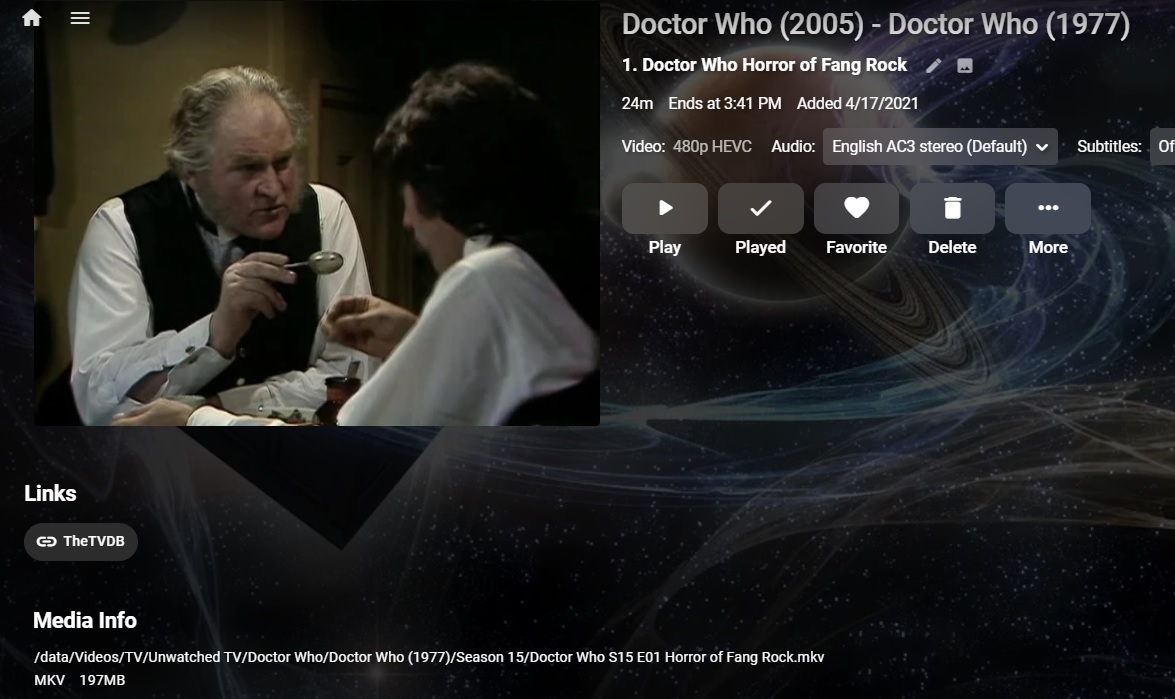 reedfh 3 Posted April 19, 2022 Posted April 19, 2022 thank you for the reply. i'm sure the directory structure is correct based on my research on this topic via the community forum and online. tho i understand that multiple formats are okay. one thing i like about Emby. I tried several and none work. I'm glad to use any directory structure/filename if it works. You can see the full path to the file under media info. nothing is nested. the only thing in the final folder is the media file (as shown above); that is other than what Emby added. i've removed every episode from the server but the one shown above. so there is nothing in any of the folders that you don't see. I'm pretty sure this is a problem with Emby or maybe i have some setting off. I think the confusion comes from the fact that BBC made 2 different runs for Doctor Who. Season 1 to 15 (That ended in 1977) then restarted it with Series 1 and are currently in production of Series 14 i believe... Emby seems to be trying to pull meta data from the Series, instead of from from the Seasons... I'm guessing it sees duplicate episodes and simply pulls the more recent. This is most certainly an edge case. so it's easy to imagine that it would be a test case. Before looking into this i never gave a second thought to duplicate episode numbers. let me know if there is an alternate dir structure to try or a different filename. the one thing that i don't understand is that Emby has correctly recorded and assoicated the TVDB ID with this episode. Seems like it would pull the metadata based on this link.