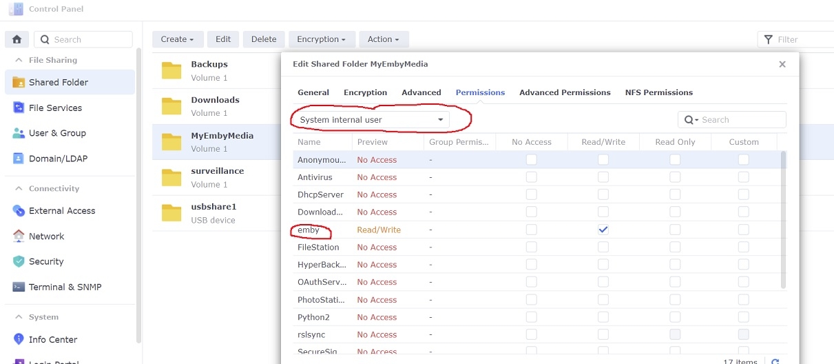 Ignore that other user.  The only user you need under DSM 7 is the "System internal user" Emby.  You will need to use the dropdown box to see it when setting the read/write permissions on the shares.