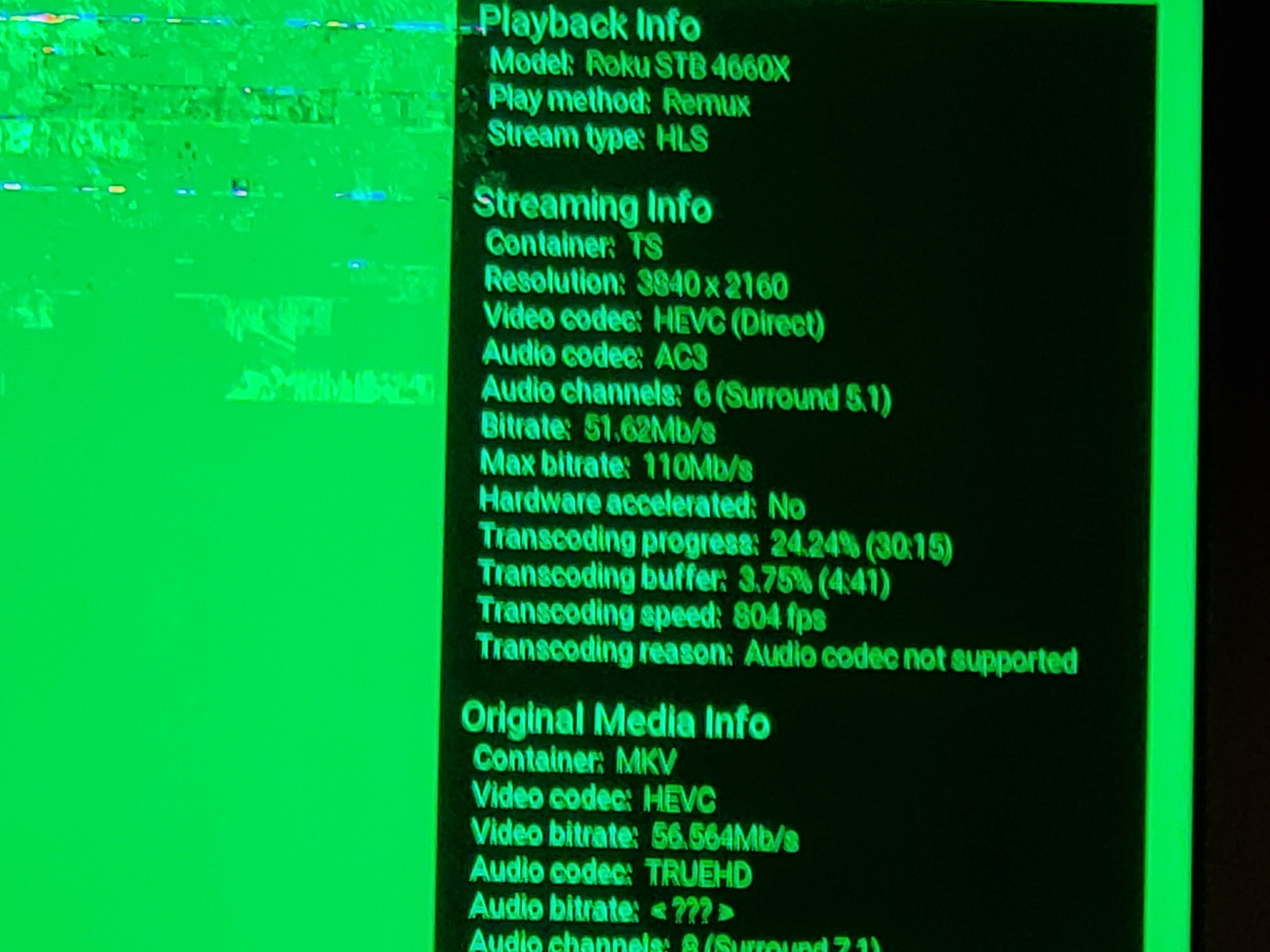 JeremyG 30 Posted December 24, 2021 Posted December 24, 2021 (edited) I have a number of UHD videos with TrueHD. TrueHD needs to be remuxed to be played on my Roku Ultra. For some movies this works just fine. For others, i get video corruption when the audio is being remuxed (but video is direct). With the exact same file, if I choose an audio track like "English Stereo" it goes to directplay and everything is fine (but sounds like crap) If i fast-forward into the movie, so parts get remuxed with no video corruption...but other parts do. This happens whether Hardware transcoding is enabled or diasabled. Any idea what this happens? ffmpeg-remux-d0e29c8c-2428-49bb-b1cc-d48b1d1fd722_1.txt Edited December 24, 2021 by JeremyG