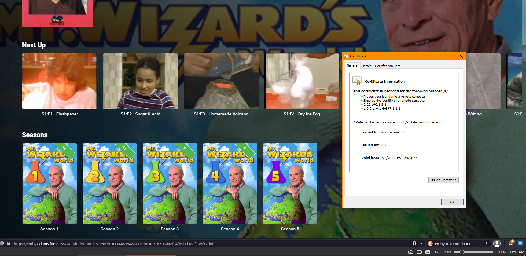 ebr 16169 Posted February 6, 2022 Posted February 6, 2022 19 minutes ago, Baenwort said: Once there I could use the http port (8096) and connect to the server host 'emby.adams.fun' but when I changed the host to 'https://emby.adams.fun' and the port to 8265 (my https port) I got error code (-60) when I had https:// at the start of the host name and error (-40) when I forgot to include that. Okay, so that tells me it is a certificate problem. Let's Encrypt certs had a root (or maybe intermediate) expire late last year and that caused a lot of issues with older and more strict devices.