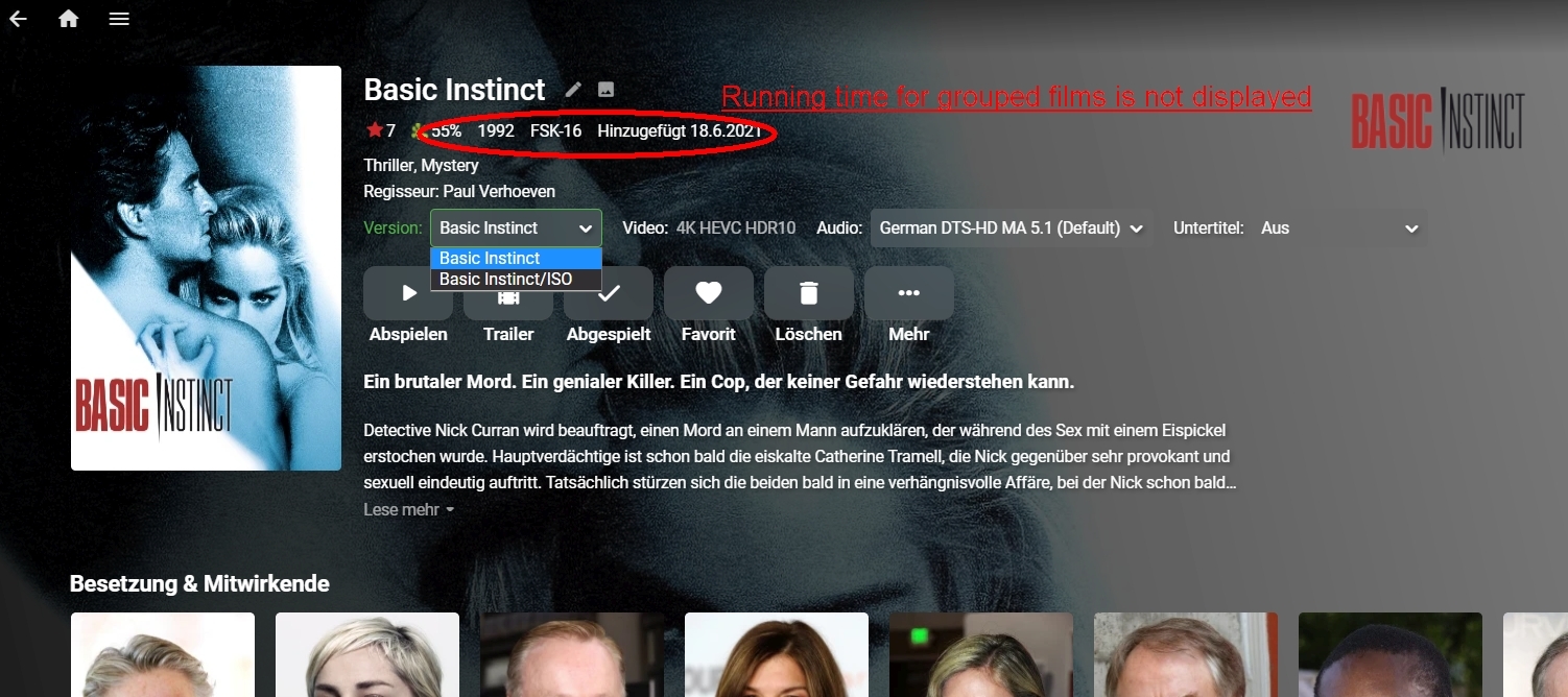 Happy2Play 9785 Posted January 11, 2022 Posted January 11, 2022 4 minutes ago, mixXxim said: Assumption: because then the ISO is taken as the primary film and the running time cannot be determined, although the ISO is in the second position in the selection. There is no dynamic information on multi-versioning. Emby will only present info for one item in the group no matter what version is selected.