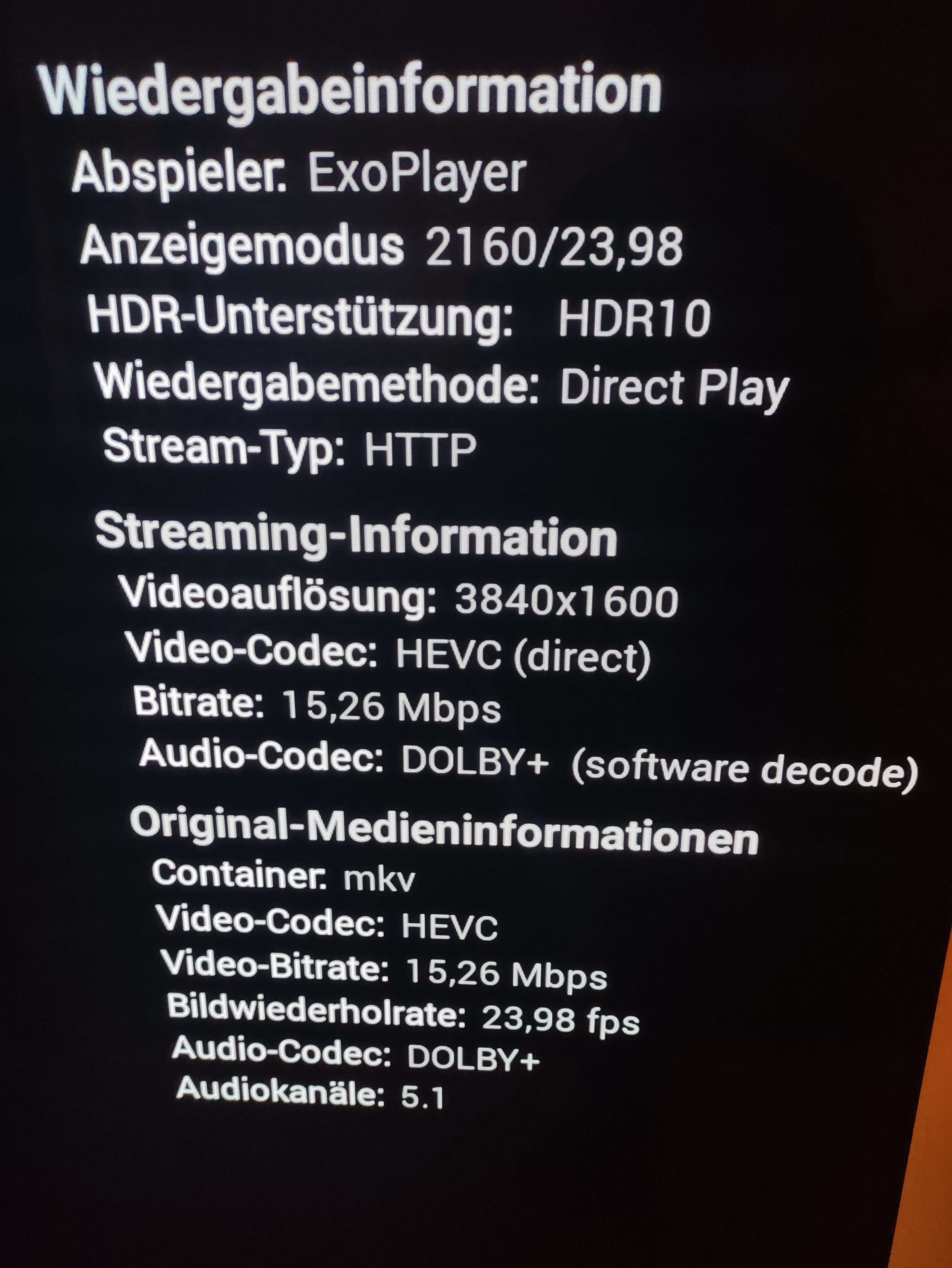 goenngoenn 2 Posted January 27, 2022 Author Posted January 27, 2022 2 hours ago, ebr said: It isn't transcoding anything because you turned those permissions off in the server. EnableVideoPlaybackTranscoding: False EnableAudioPlaybackTranscoding: False Please re-enable those and see if it works as expected. OH my God I'm actually so retarded. I disabled it when I tried out some stuff with emby on my LG and dts. Thanks! Although I'm still asking myself why it's playing dolby+ when I disabled dolby+ in the shield menu and how it plays audio? Does the shield itself encode it to pcm or how does this work? (If I set it to auto and not to transcode it to dolby).