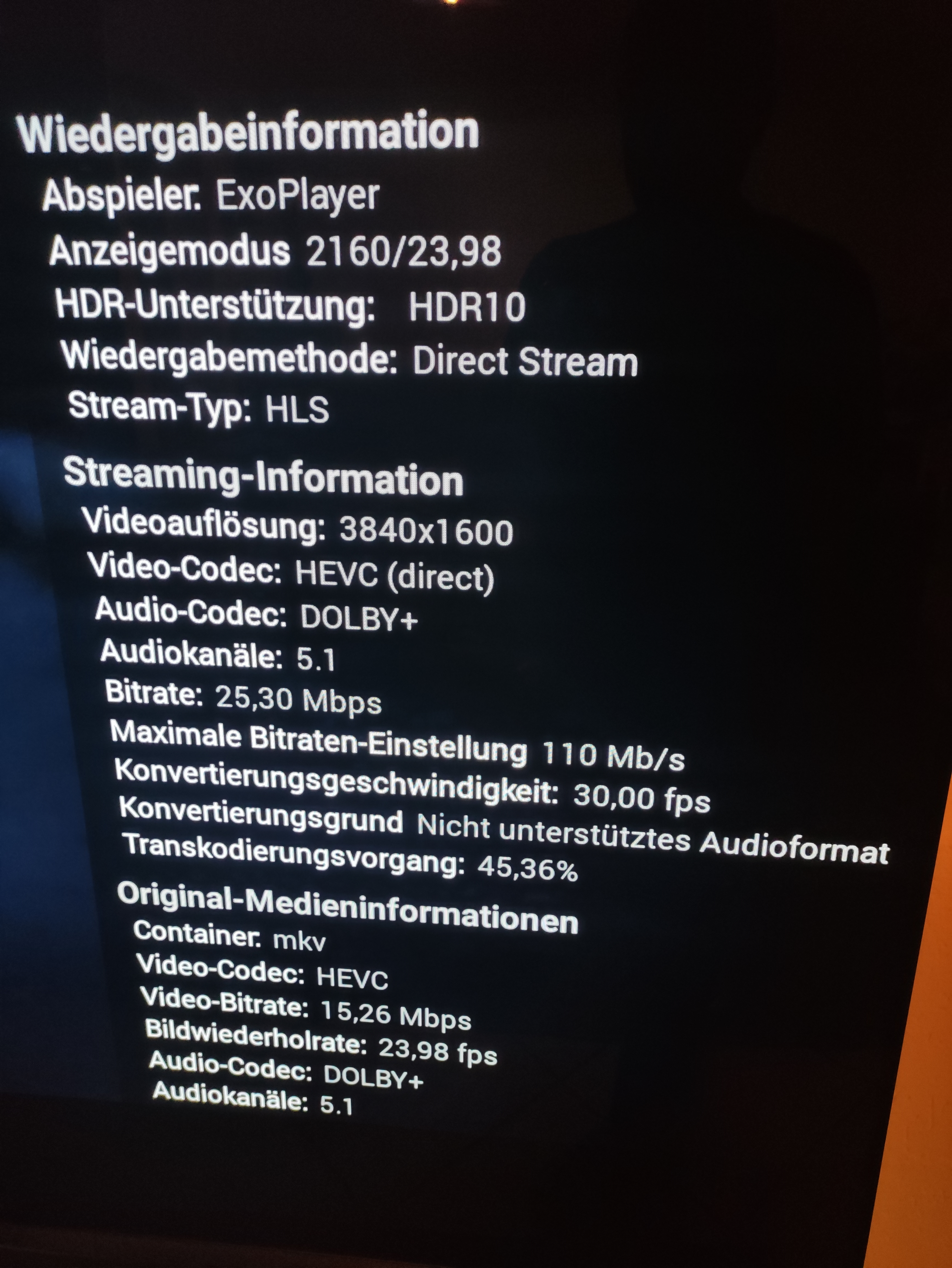 goenngoenn 2 Posted January 27, 2022 Author Posted January 27, 2022 (edited) 1 hour ago, ebr said: Can I please see an ffmpeg log example of that? Sure! First of all I noticed that when I leave Audio on Auto in the Emby Client settings it won't transcode at all and Play Dolby+ in Direct Play. Although my shield then outputs pcm to my soundbar. If I choose 'transcode not supported Codecs to dolby digital' it transcodes it to something, see 2nd picture but my shield still outputs pcm to my soundbar. The ffmpeg log is in the spoiler. Spoiler 2022-01-27 17:20:41.224 Operating System: Linux version 5.10.63-v7l+ (dom@buildbot) (arm-linux-gnueabihf-gcc-8 (Ubuntu/Linaro 8.4.0-3ubuntu1) 8.4.0, GNU ld (GNU Binutils for Ubuntu) 2.34) #145 OS/Process: arm/arm Emby Server version: 4.6.7.0 Operating system: Unix 5.10.63.7 Command Line: /app/emby/EmbyServer.dll -programdata /config -ffdetect /app/emby/ffdetect -ffmpeg /app/emby/ffmpeg -ffprobe /app/emby/ffprobe -restartexitcode 3 App: AndroidTv 2.0.48g SHIELD http://192.168.178.50:8096/emby/videos/8075/hls1/main/231.ts?DeviceId=a1fd381602c9cc23&MediaSourceId=19a04b45f3cd16c2391c40a0701253f6&PlaySessionId=786de54df3134abb945678602037c6ec&api_key=66d322ba4e9c446f89f25d0c4c0511a3&VideoCodec=h264,mpeg2video,hevc,h265&AudioCodec=aac_latm,mp4a_latm,ac3,dts,dca,dtshd,aac,mp3&VideoBitrate=109616000&AudioBitrate=384000&MaxHeight=2176&AudioStreamIndex=1&SubtitleStreamIndex=10&SubtitleMethod=Hls&CopyTimestamps=true&SegmentContainer=ts&MinSegments=2&AllowInterlacedVideoStreamCopy=True&BreakOnNonKeyFrames=True&ManifestSubtitles=vtt&h264-profile=high,main,baseline,constrainedbaseline,high10&h264-level=52&hevc-profile=Main,Main10&aac_latm-audiochannels=8&mp4a_latm-audiochannels=8&ac3-audiochannels=8&dts-audiochannels=8&dca-audiochannels=8&dtshd-audiochannels=8&aac-audiochannels=2&mp3-audiochannels=8&TranscodeReasons=AudioCodecNotSupported {"Protocol":"File","Id":"19a04b45f3cd16c2391c40a0701253f6","Path":"/data/movies/xy.mkv","Type":"Default","Container":"mkv","Size":11805454663,"Name":"xy","IsRemote":false,"RunTimeTicks":61869440000,"SupportsTranscoding":true,"SupportsDirectStream":true,"SupportsDirectPlay":true,"IsInfiniteStream":false,"RequiresOpening":false,"RequiresClosing":false,"RequiresLooping":false,"SupportsProbing":false,"MediaStreams":[{"Codec":"hevc","ColorTransfer":"smpte2084","ColorPrimaries":"bt2020","ColorSpace":"bt2020nc","TimeBase":"1/1000","CodecTimeBase":"1001/24000","VideoRange":"HDR10","DisplayTitle":"4K HEVC HDR10","IsInterlaced":false,"BitRate":15264989,"BitDepth":10,"RefFrames":1,"IsDefault":true,"IsForced":false,"Height":1600,"Width":3840,"AverageFrameRate":23.976025,"RealFrameRate":23.976025,"Profile":"Main 10","Type":"Video","AspectRatio":"2.40:1","Index":0,"IsExternal":false,"IsTextSubtitleStream":false,"SupportsExternalStream":false,"Protocol":"File","PixelFormat":"yuv420p10le","Level":150,"IsAnamorphic":false},{"Codec":"eac3","Language":"eng","TimeBase":"1/1000","CodecTimeBase":"1/48000","Title":"DDP 5.1","DisplayTitle":"English EAC3 6 ch (Default)","DisplayLanguage":"English","IsInterlaced":false,"Channels":6,"SampleRate":48000,"IsDefault":true,"IsForced":false,"Type":"Audio","Index":1,"IsExternal":false,"IsTextSubtitleStream":false,"SupportsExternalStream":false,"Protocol":"File"},{"Codec":"subrip","Language":"eng","TimeBase":"1/1000","CodecTimeBase":"0/1","Title":"FORCED","DisplayTitle":"English (Default Forced SUBRIP)","DisplayLanguage":"English","IsInterlaced":false,"IsDefault":true,"IsForced":true,"Type":"Subtitle","Index":2,"IsExternal":false,"IsTextSubtitleStream":true,"SupportsExternalStream":true,"Protocol":"File"},{"Codec":"subrip","Language":"eng","TimeBase":"1/1000","CodecTimeBase":"0/1","DisplayTitle":"English (SUBRIP)","DisplayLanguage":"English","IsInterlaced":false,"IsDefault":false,"IsForced":false,"Type":"Subtitle","Index":3,"IsExternal":false,"IsTextSubtitleStream":true,"SupportsExternalStream":true,"Protocol":"File"},{"Codec":"subrip","Language":"eng","TimeBase":"1/1000","CodecTimeBase":"0/1","Title":"SDH","DisplayTitle":"English (SUBRIP)","DisplayLanguage":"English","IsInterlaced":false,"IsDefault":false,"IsForced":false,"Type":"Subtitle","Index":4,"IsExternal":false,"IsTextSubtitleStream":true,"SupportsExternalStream":true,"Protocol":"File"},{"Codec":"mjpeg","ColorSpace":"bt470bg","TimeBase":"1/90000","CodecTimeBase":"0/1","IsInterlaced":false,"BitDepth":8,"RefFrames":1,"IsDefault":false,"IsForced":false,"Height":176,"Width":120,"RealFrameRate":90000,"Profile":"Baseline","Type":"EmbeddedImage","AspectRatio":"15:22","Index":5,"IsExternal":false,"IsTextSubtitleStream":false,"SupportsExternalStream":false,"Protocol":"File","PixelFormat":"yuvj444p","Level":-99},{"Codec":"mjpeg","ColorSpace":"bt470bg","TimeBase":"1/90000","CodecTimeBase":"0/1","IsInterlaced":false,"BitDepth":8,"RefFrames":1,"IsDefault":false,"IsForced":false,"Height":120,"Width":213,"RealFrameRate":90000,"Profile":"Baseline","Type":"EmbeddedImage","AspectRatio":"71:40","Index":6,"IsExternal":false,"IsTextSubtitleStream":false,"SupportsExternalStream":false,"Protocol":"File","PixelFormat":"yuvj444p","Level":-99},{"Codec":"mjpeg","ColorSpace":"bt470bg","TimeBase":"1/90000","CodecTimeBase":"0/1","IsInterlaced":false,"BitDepth":8,"RefFrames":1,"IsDefault":false,"IsForced":false,"Height":882,"Width":600,"RealFrameRate":90000,"Profile":"Baseline","Type":"EmbeddedImage","AspectRatio":"100:147","Index":7,"IsExternal":false,"IsTextSubtitleStream":false,"SupportsExternalStream":false,"Protocol":"File","PixelFormat":"yuvj444p","Level":-99},{"Codec":"mjpeg","ColorSpace":"bt470bg","TimeBase":"1/90000","CodecTimeBase":"0/1","IsInterlaced":false,"BitDepth":8,"RefFrames":1,"IsDefault":false,"IsForced":false,"Height":600,"Width":1067,"RealFrameRate":90000,"Profile":"Baseline","Type":"EmbeddedImage","AspectRatio":"1067:600","Index":8,"IsExternal":false,"IsTextSubtitleStream":false,"SupportsExternalStream":false,"Protocol":"File","PixelFormat":"yuvj444p","Level":-99},{"C