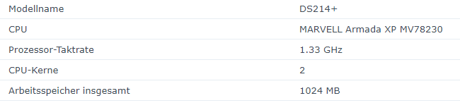 Synology: DS214+, 2 Core ARM v7, 1024MB RAM