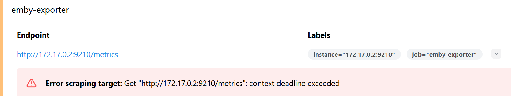 jleiss 0 Posted February 23, 2025 Posted February 23, 2025 I get target refused when using the machine IP exporter logs jleiss@bree:/opt/prometheus$ docker logs emby_exporter 10:46:36 | INFO | main.go:37 > Using America/Chicago 10:46:36 | INFO | app.go:56 > Beginning to serve on port 9210 10:46:36 | INFO | app.go:57 > You can see the metrics on http://localhost:9210/metrics 11:08:00 | INFO | main.go:37 > Using America/Chicago 11:08:00 | INFO | app.go:56 > Beginning to serve on port 9210 11:08:00 | INFO | app.go:57 > You can see the metrics on http://localhost:9210/metrics 11:15:02 | INFO | main.go:37 > Using America/Chicago 11:15:02 | INFO | app.go:56 > Beginning to serve on port 9210 11:15:02 | INFO | app.go:57 > You can see the metrics on http://localhost:9210/metrics