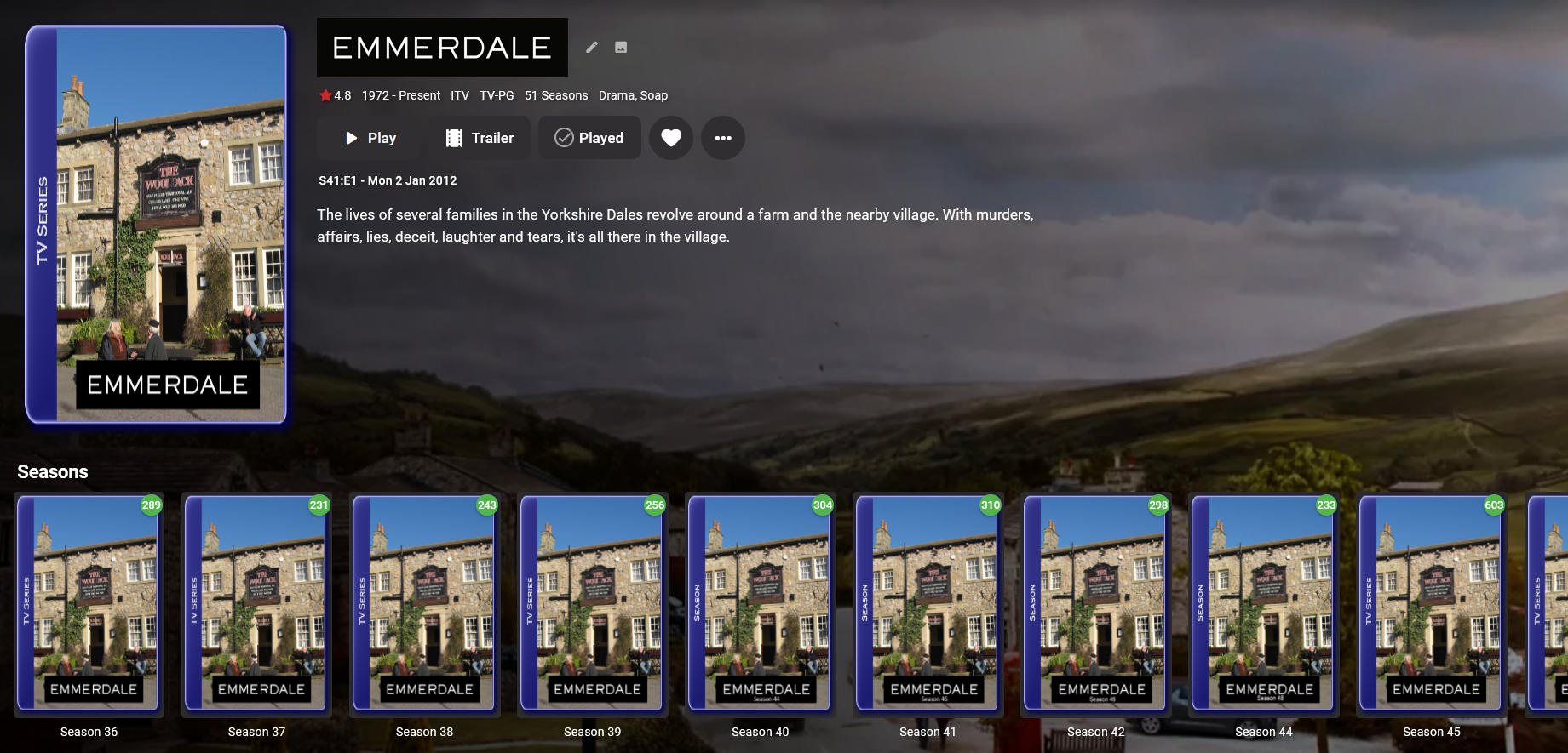 kjhedges 67 Posted February 22, 2022 Posted February 22, 2022 I have a little problem with emmerdale TV Series. Currently there are 51 seasons. I have episodes for all seasons from season through to 51. (Minus the obvious episodes that just don't exist. My problem is that Season 43 just will not show and all episodes are in season 45. I have checked the info in each episode and the relevant ones for season 43 are saying season 43 episode(whatever episode number) but will not show a season 43. Has anyone else got emmerdale in there library and does it show correct seasons? I have tried removing whole series off drive and adding season 1 through 51, but this failed to add season 43.