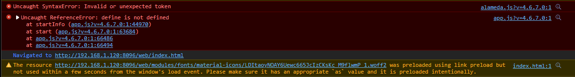 Luke 42085 Posted February 28, 2022 Posted February 28, 2022 OK I'm afraid I don't know, sorry. Something in your browser configuration is interfering with our JavaScript, and you'll need to hunt down what that is. You can see it in the console log: content-scripts.js:1 INS: content-ads.js loaded: http://192.168.1.120:8096/web/index.html content-scripts.js:1 TSS: content-tss.js loaded: http://192.168.1.120:8096/web/index.html content-scripts.js:1 INS: content-blocked-items.js loaded: http://192.168.1.120:8096/web/index.html content-scripts.js:1 TSS: Excluding content tss (trigger: send-mesage) content-scripts.js:1 CONTENT_SHELL: Page allowed. Skipping shell injection blocks bower_components/ala…meda.js?v=4.6.7.0:1 Uncaught SyntaxError: Invalid or unexpected token app.js?v=4.6.7.0:1 Uncaught ReferenceError: define is not defined at startInfo (app.js?v=4.6.7.0:1:44970) at start (app.js?v=4.6.7.0:1:63684) at app.js?v=4.6.7.0:1:66486 at app.js?v=4.6.7.0:1:66494 index.html:1 Whatever content-tss.js is, or content-blocked-items.js, or content-ads.js...none of those are Emby javascript.