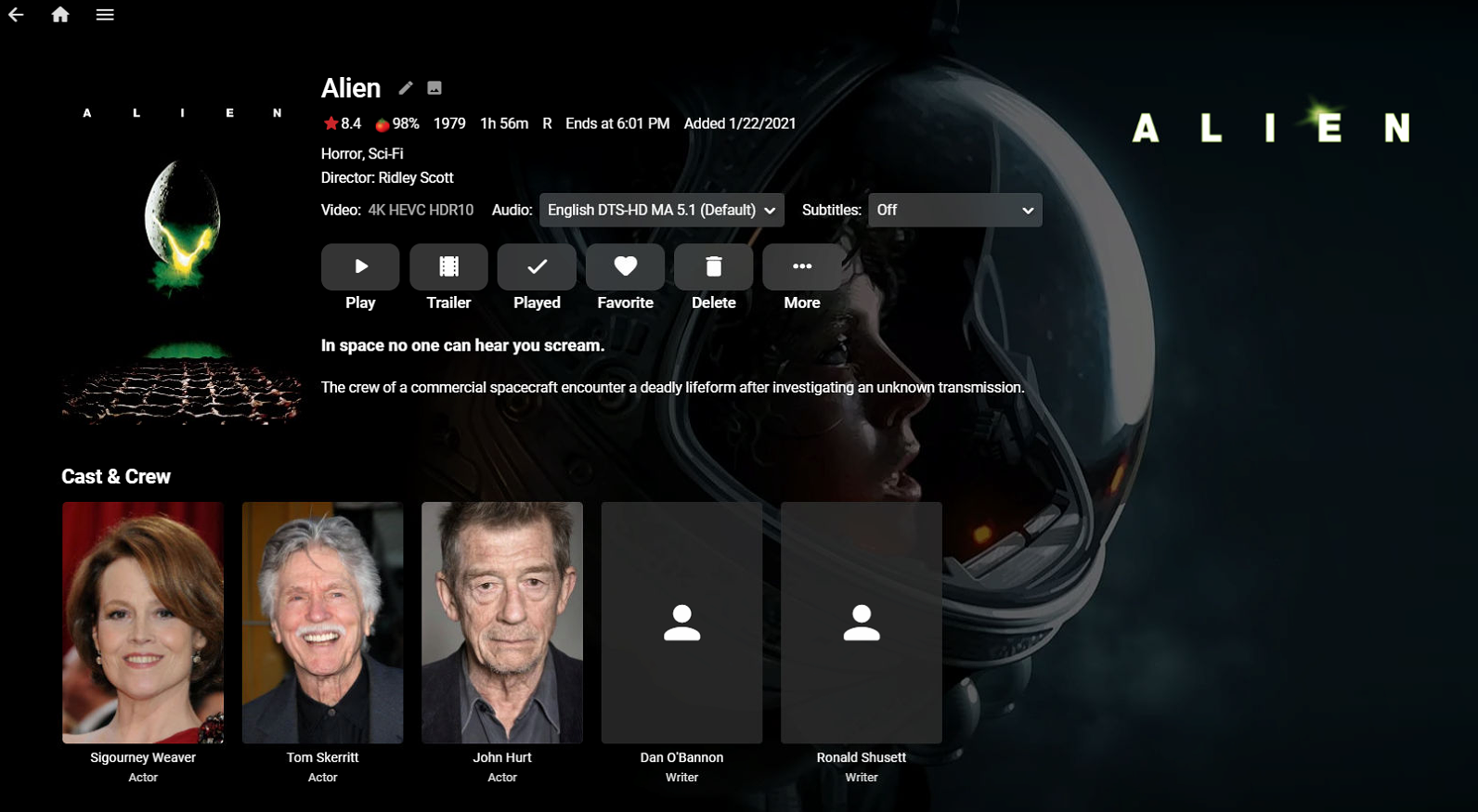 Tliner4Life 2 Posted March 2, 2022 Author Posted March 2, 2022 (edited) Hi Luke, no I wish that were the case, but it's literally every movie in my vast collection. Take for example the movie Alien. The moviedb link: https://www.themoviedb.org/movie/348-alien Shows 10 different cast members. Here's what it looks like in my Emby: And here's the library settings: Edited March 2, 2022 by Tliner4Life