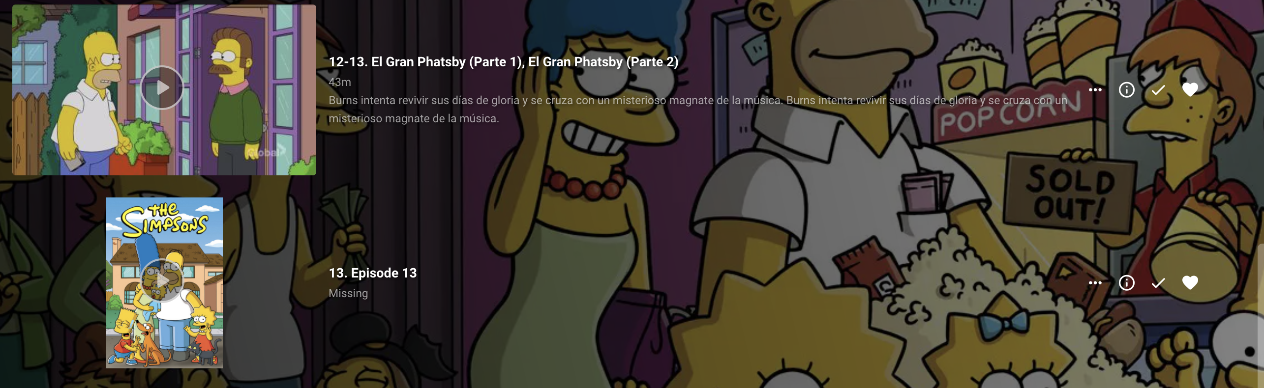 DarkStar1977 119 Posted March 3, 2022 Posted March 3, 2022 (edited) Dears, I'm strgugling on naming a double chapter of "The Simpsons" show in season 28. The chapter 12 is a double chapter (12 & 13) and I've this named as: 28x12-13 - El Gran Phatsby.s28e12e13.mkv Emby is acting strangely as is showing the chapter 12 with descriptions of chapter 12 and 13 but still says chapter 13 is missing: I'm pretty sure is something wrong with this show and Emby as in the same season there's another double chapter (21-22), named same as 12-13: 28x21-22 - La Casa Moho - Ciudad Perro.s28e21e22.mkv and showing it correctly on the season: I've tried all combinations renaming the chapter as described here: https://support.emby.media/support/solutions/articles/44001159110-tv-naming but the chapter 13 still appears missing. Any help will be much appreciated. Thanks in advance. Edited March 3, 2022 by DarkStar1977