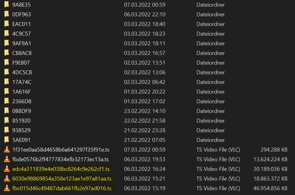 Svennie 4 Posted March 7, 2022 Author Posted March 7, 2022 (edited) I'm at home now and I've looked into the transcoding temp folder. I currently have 5 ts files there. 2 LiveTV channels are being watched and 3 channels are just running in the background, although the client is no longer switched on. The files in the temp folder are getting bigger and bigger. I have attached a picture of the folder. The files marked in yellow are the channels that are no longer watched. embyserver-63782208003.txt Edited March 7, 2022 by Svennie