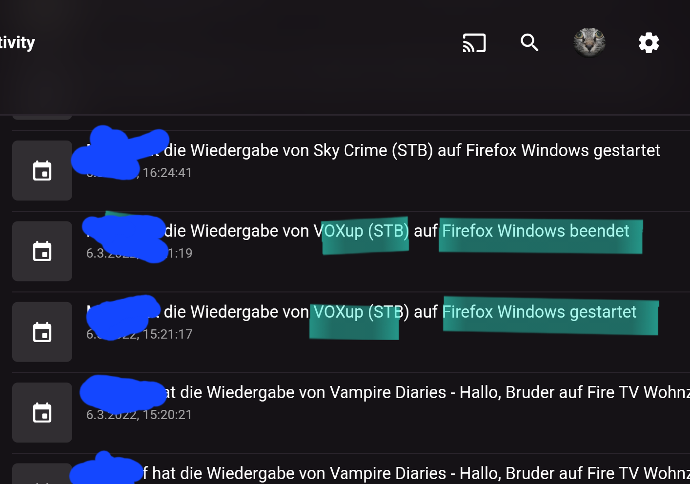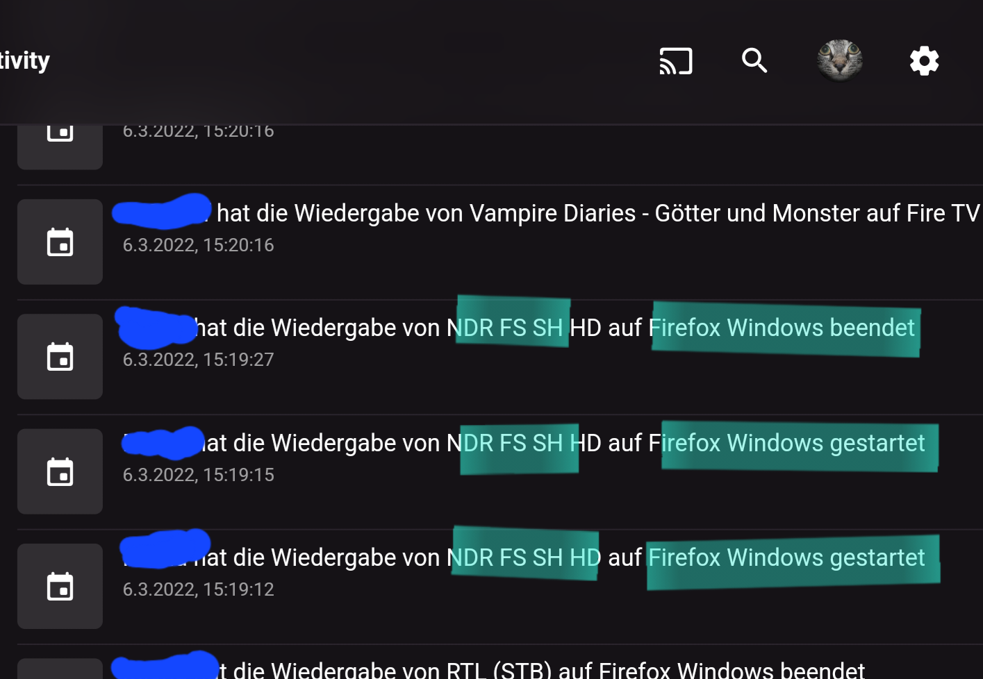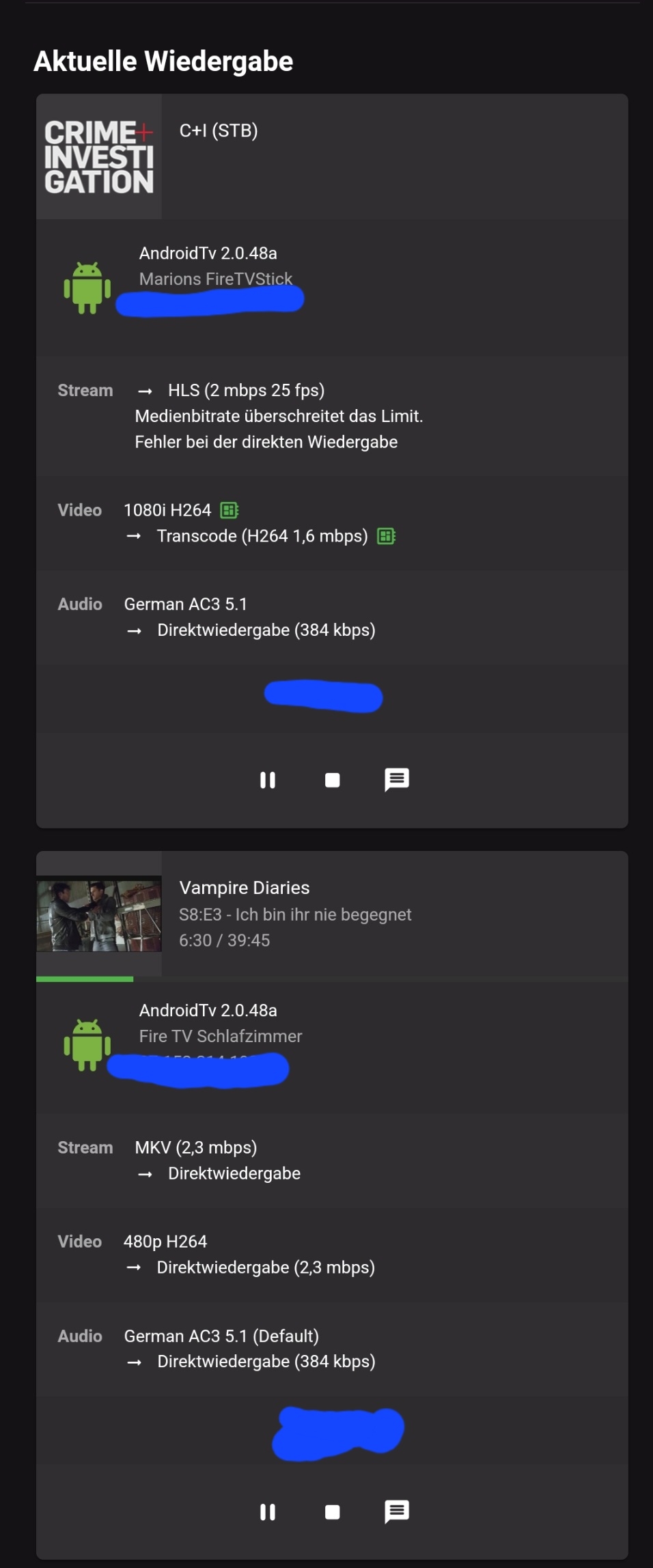 Svennie 4 Posted March 6, 2022 Author Posted March 6, 2022 Spoiler You can see that in the third picture. The station is called "NDR FS SH". The station started twice but only ended once. The "VoxUP" station only started once, was terminated by the web client, but continues to run in the background and is no longer displayed in the emby backend.