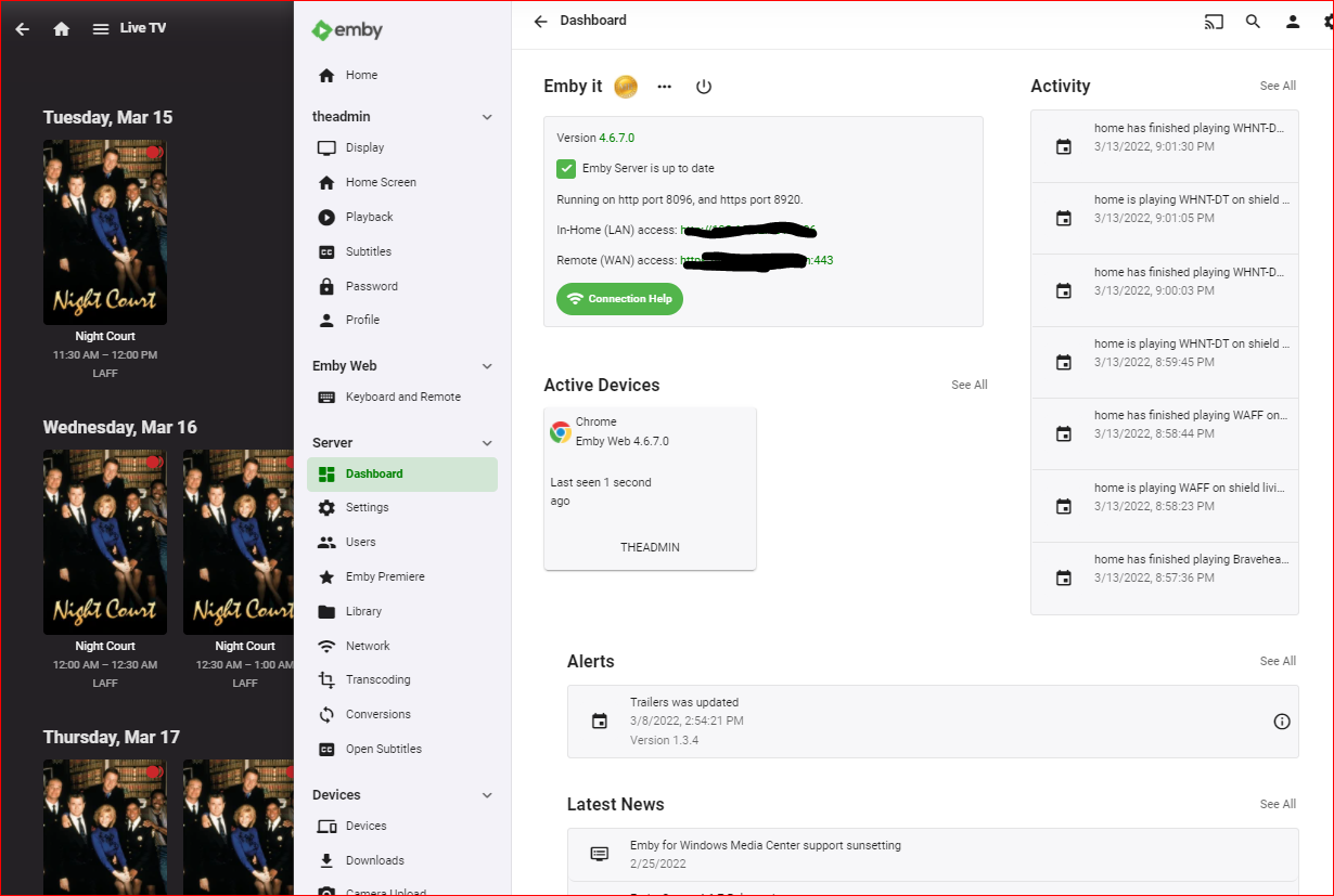 justinrh 260 Posted March 15, 2022 Author Posted March 15, 2022 @Luke I love your "Let's look at an example" I have a TV series "Night Court" set to record and store in F:\xfer\_NC. When a show is being recorded, it is not indicated anywhere in the Settings > Dashboard or the home page or Live TV > Recordings or Live TV > Schedule. The only way I can know it is being recorded is if I poke the HDHomeRun for stats. At the time this screenshot was taken (~11:15am), a show was being recorded: embyserver.txt