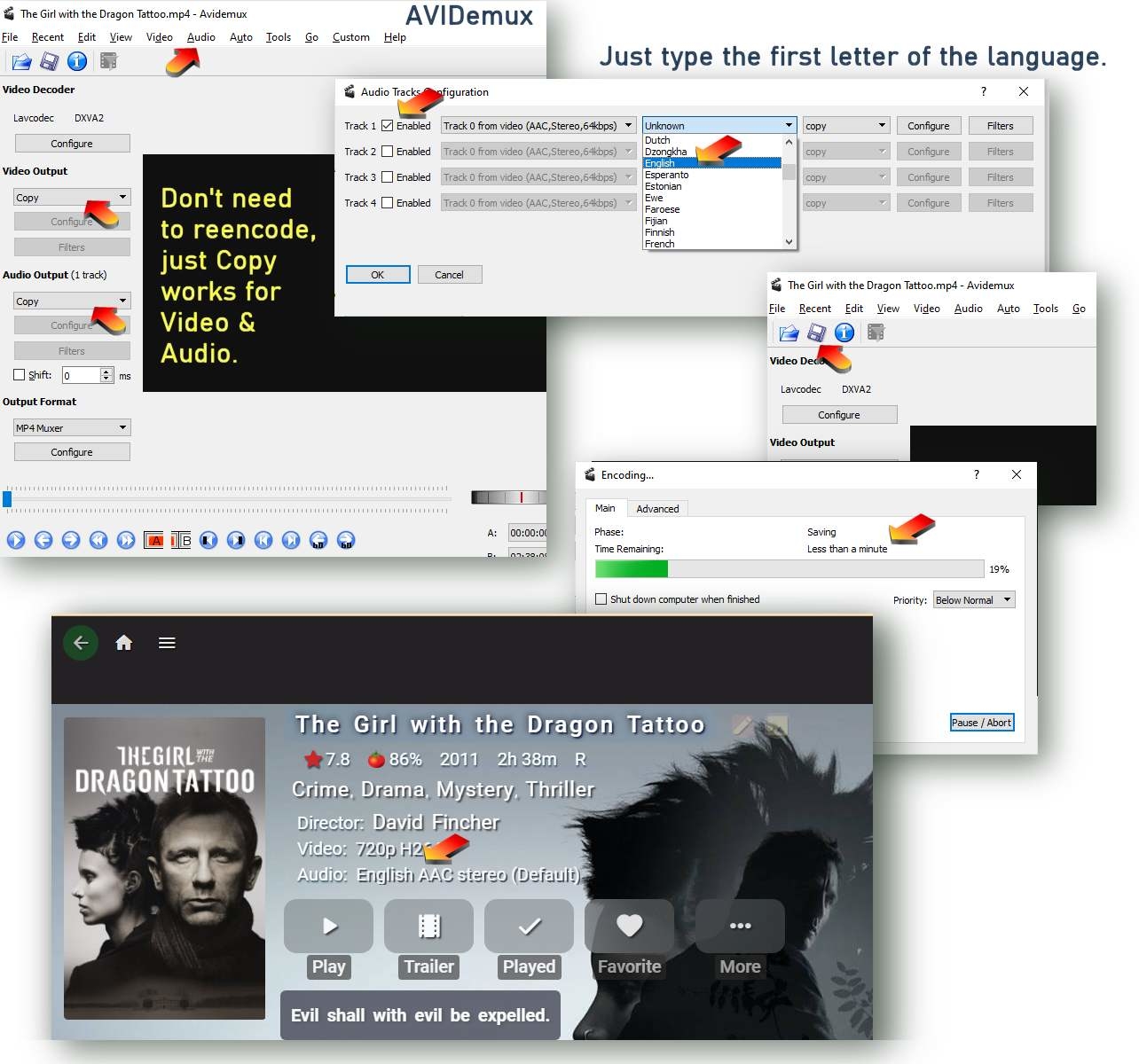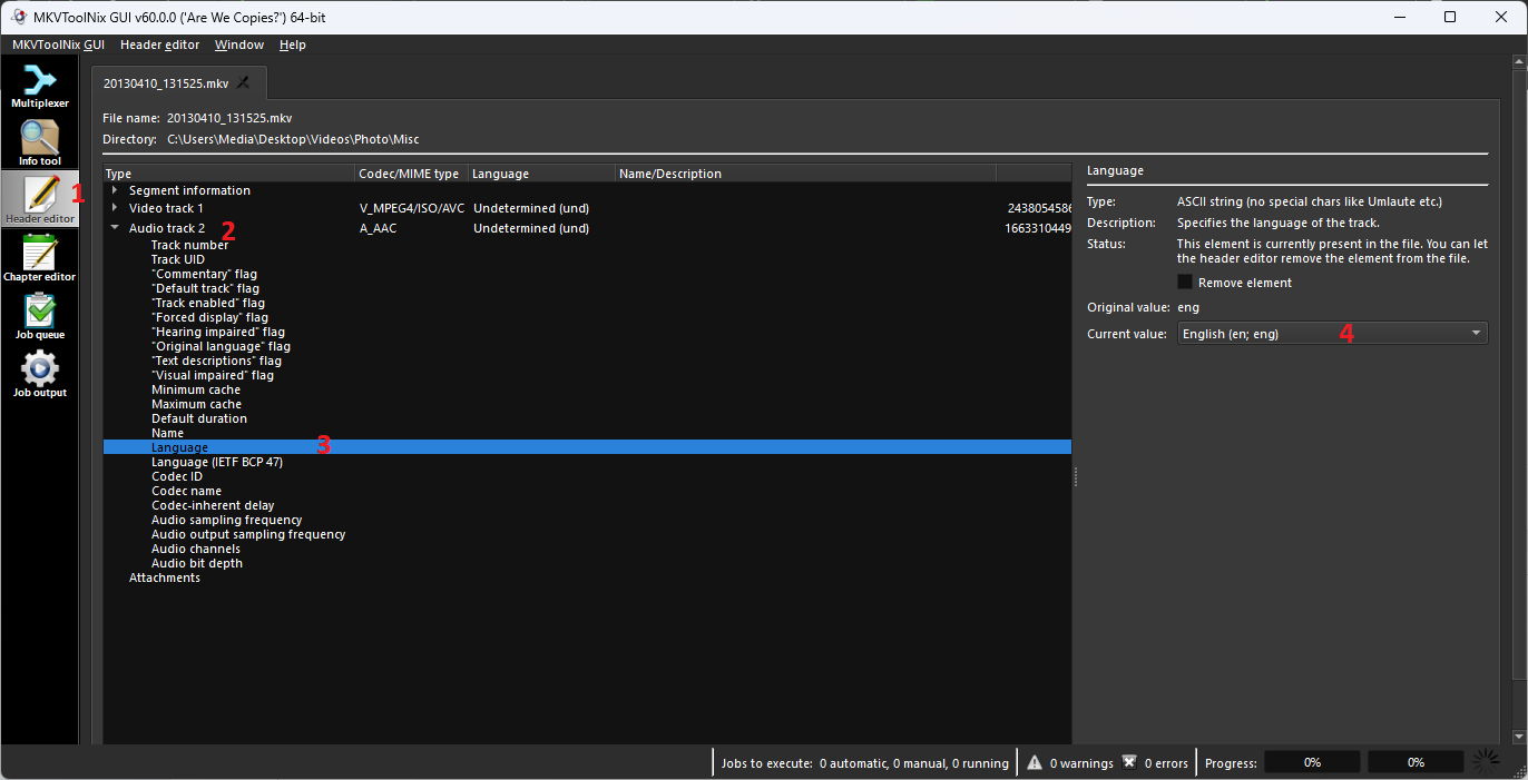 visproduction 316 Posted March 17, 2022 Posted March 17, 2022 (edited) I have found the only way to change the language for .mp4, is to change the metadata in the video file. I assume that the nfo data pulls from there and ignores any effort to edit the .nfo file. When I use AVIdemux video encoder - https://avidemux.org/, Audio tab, type the first letter of the language you want, save and copy Video and Audio to a new updated video file. It only takes under a minute to update a full 2 hour video. When you copy this video back into Emby library, the correct langauge appears. I would think other video editors can also do this. I know it works with AVIdemux. (It probably can work with just a ffmpeg command line and could be batched to handle 1000 films at once.) Edited March 17, 2022 by visproduction