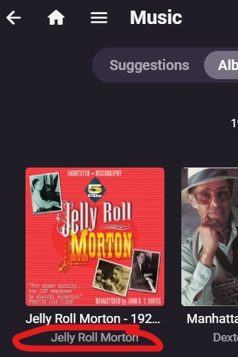nospotify 184 Posted July 27, 2022 Author Posted July 27, 2022 (edited) @Luke I am afraid I don't understand - what wasn't complete above in my bug report? Here's another example. I recently added this Jelly Roll Morton album to my library, the first by him in my library. And once again, no "Album Artist" nor "Artist" image was retrieved when the album was added, although all other metadata was added/retrieved correctly. After putting those music files in my Music Library hard drive directory, from the Emby server homepage, I did a Scan Library Files (which is how the album was added to my library), but this apparently did not lead to Emby downloading the appropriate Album Artist nor Artist image. What other information do you need to debug this? Edited July 27, 2022 by wordlover