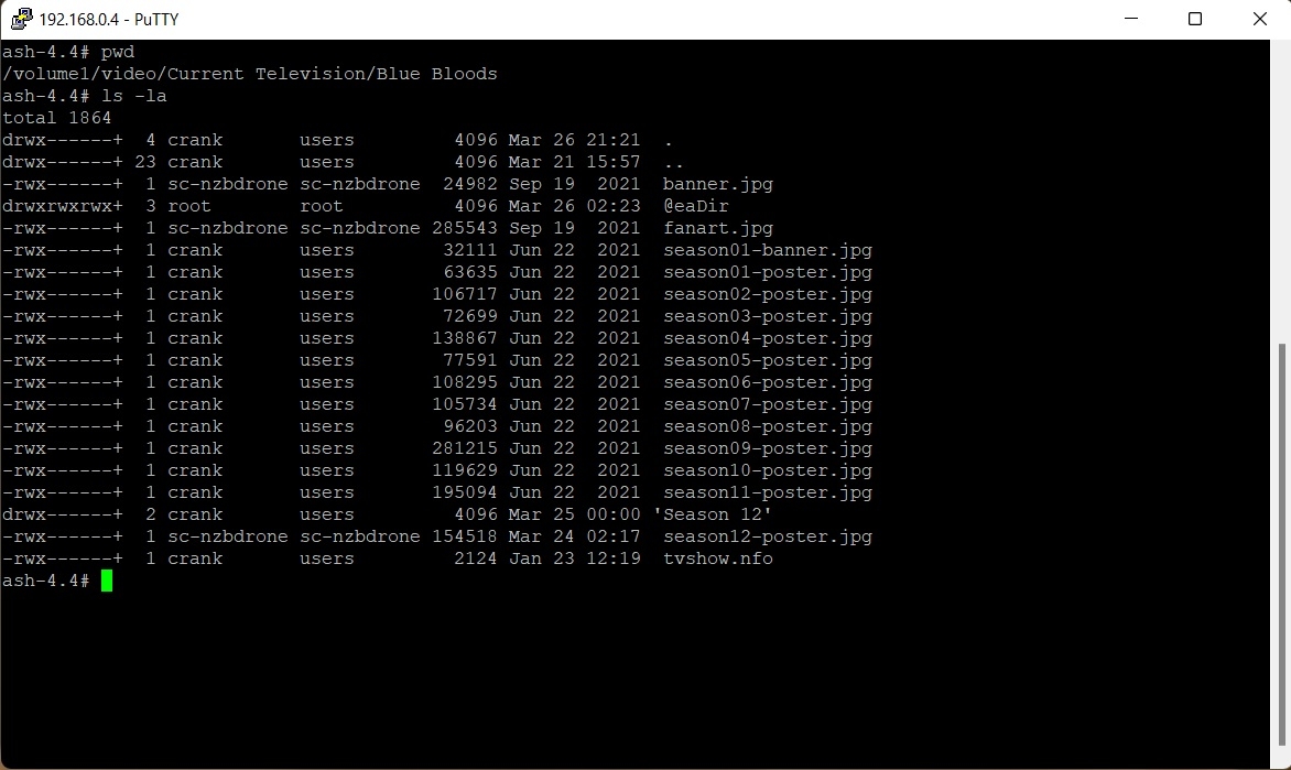 ClemFandango 18 Posted March 26, 2022 Author Posted March 26, 2022 10 minutes ago, Happy2Play said: Did this image actually get deleted? As you see one is saved to /metadata and original supposedly gets deleted from with media. 2022-03-26 21:21:48.333 Info HttpClient: GET https://www.thetvdb.com/banners/posters/5ba9678b8729a.jpg 2022-03-26 21:21:48.603 Debug ProviderManager: Saving image to /var/packages/EmbyServer/var/metadata/library/5a/5a3d7cb58414b20f9492d9d86d41d37e/poster.jpg 2022-03-26 21:21:48.680 Info ProviderManager: Deleting previous image /volume1/video/Current Television/Blue Bloods/poster.jpg But am guessing that is actually not happening and gets restored later. Now I'm signed in via Putty at the moment and I'm looking directly at the "Blue Bloods" folder and the file "poster.jpg" is indeed gone. I've attached a screengrab as proof.