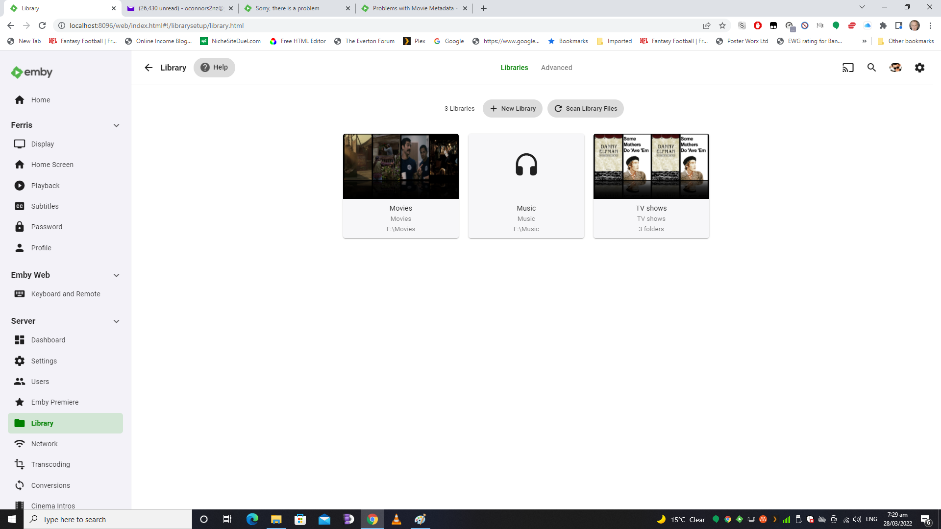 SeanOC 3 Posted March 28, 2022 Author Posted March 28, 2022 6 minutes ago, GrimReaper said: Attempt No.3: Sorry for being slow to respond on this. My one TV show (so far) is actually fine. When I click on TV Shows in Emby, I get all my content as well. Movies etc. Screenshot attached (TV3). Hoping the other screenshots are what you are wanting.