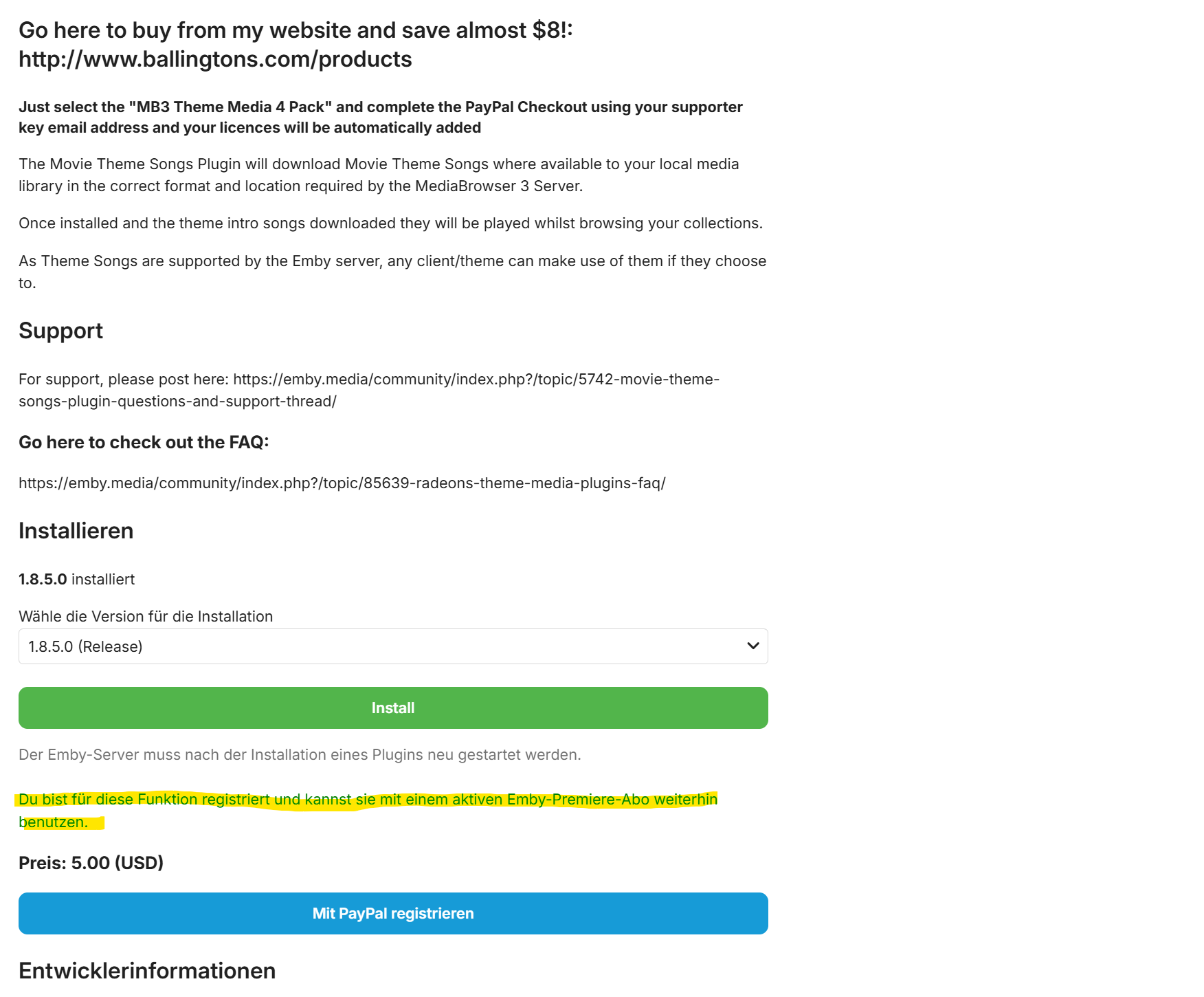 muchi2007 0 Posted June 8, 2025 Posted June 8, 2025 Hello, i hope somebody can help me with my problem. Today i've purchased the "Emby Theme Media Full Price" Package. I've got the same Key like my Server licensed. Than I've installed the TV-Theme Songs and Movid Theme Songs Plugin to my Emby Server. In the install screen i get the message of the picture, so i think all is good. When i download the local TV Show Songs all of them working great. But when i want to download the local Movie Theme Songs than the task running for only 1 Second. In the Log-File i get the error: 2025-06-08 08:02:59.704 Info App: Movie Theme Songs Registration Status - Registered: False In trial: True Expiration Date: 23.06.2025 00:00:00 Is Valid: True 2025-06-08 08:02:59.704 Info App: Movie Theme Songs 2025-06-08 08:02:59.704 Info App: In Trial - Downloading movie theme songs is only allowed for Registered Users I just reinstall the plugin and i used different versions, but the error occured again. What can i do, that Emby seems me as a registered user?