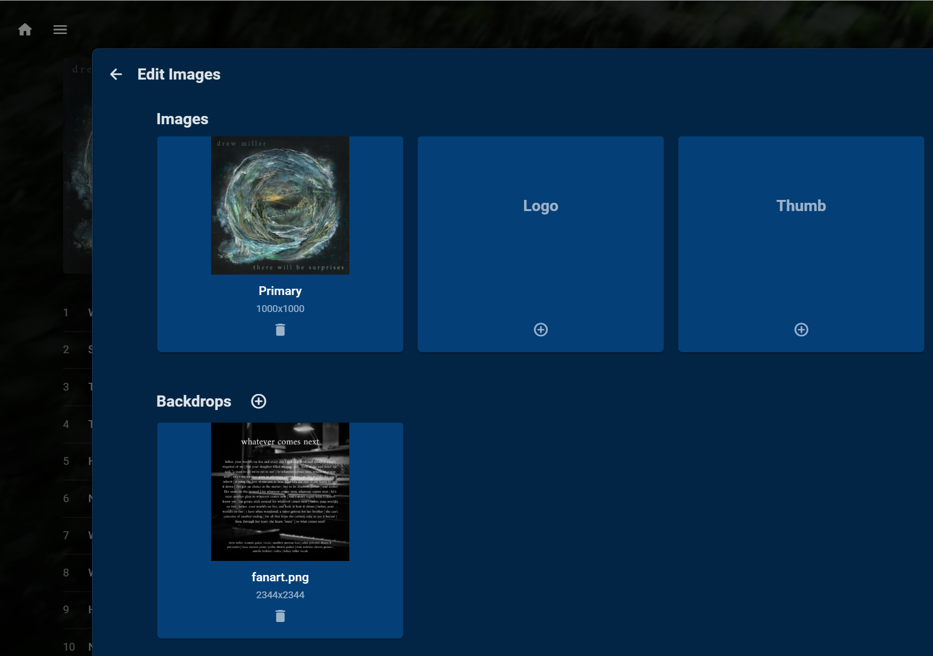 PaperPlayn 7 Posted April 4, 2022 Posted April 4, 2022 For a few of my albums, I have established backdrop images for individual songs. In the past, this feature has worked, but now it seems mostly not to. I noticed specifically when, a few days ago, I upgraded via the .apk to the latest (3.2.44) Android app. But I have the same issue in my Windows web player. I am on Emby Server version 4.6.7.0. I can update if it'll help, but I have not observed anything the changelogs for more recent versions about this issue and it appears to be app-based since it worked previously. For reference, here is my image setup. In this case my song backdrop is square. My TV Roku app (4.0.46; I have not tested the latest Beta) does display the song's backdrop image, as expected, but it squashes the square image to fit the 16:9 frame, which I'm not sure is ideal. In Windows (Chromium) web player, when I click on the song itself, the backdrop is auto-generated from the album's Primary art. On my Android app, a few days ago, I got my expected behavior: the backdrop I had assigned to the song, but not squished into the frame. (Unsure of version, but it was whatever was current on Google Play... before the app disappeared there.) After manually updating to app v. 3.2.44, however, I now get the same as on the web player: I'm curious about what broke the old/expected function and whether it can be returned? Thank you!