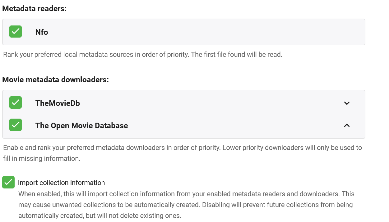 zonknz 4 Posted April 10, 2022 Posted April 10, 2022 (edited) Hi- i am using the above chain for new movies, and some things are going wrong with sorttitle metadata changes i make in Kodi, being overwritten somewhat randomly - i'm not clear why or how, or how to figure out what is going wrong. My preference is that i import the sort title from Radarr once only - from the .nfo file that Radarr writes as the movie is discovered. What is going wrong is in the Emby Collections area- I have a few collections- James Bond, for example, where i want the sort title to be James Bond, so they are displayed in Kodi's movies menu under J, in series order - i don't use or what the collection to appear in movies as a single title / nested collection - i'd prefer just all to be listed in order. I've gone through and added the sort title to be James Bond 1 through James Bond nn in each title for each title. I'm not quite clear what the metadata 'sort title' in the collection achieves, i must admit. The problem is that some movies seem to be regressing sort title back to the radarr default; i'm not really sure why, or how to prevent it? Here's the movies settings: Edited April 10, 2022 by zonknz