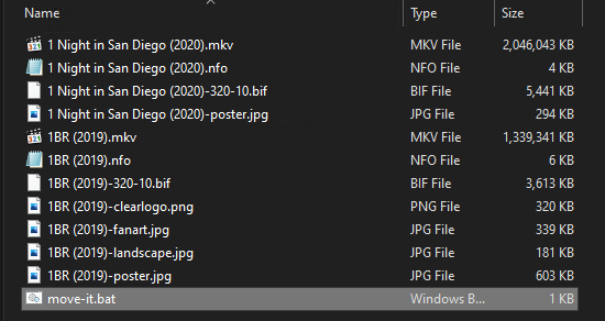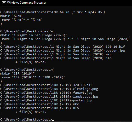 cwills75 14 Posted April 13, 2022 Author Posted April 13, 2022 If anyone else wants an easy way to create folders based on movie names and move all corresponding files into them, put this into a .bat file, save it in movie folder and run it. If you have video files other than mkv/mp4, edit it accordingly. FOR %%m in (*.mkv *.mp4) do ( mkdir "%%~nm" move "%%~nm"*.* "%%~nm" ) 1