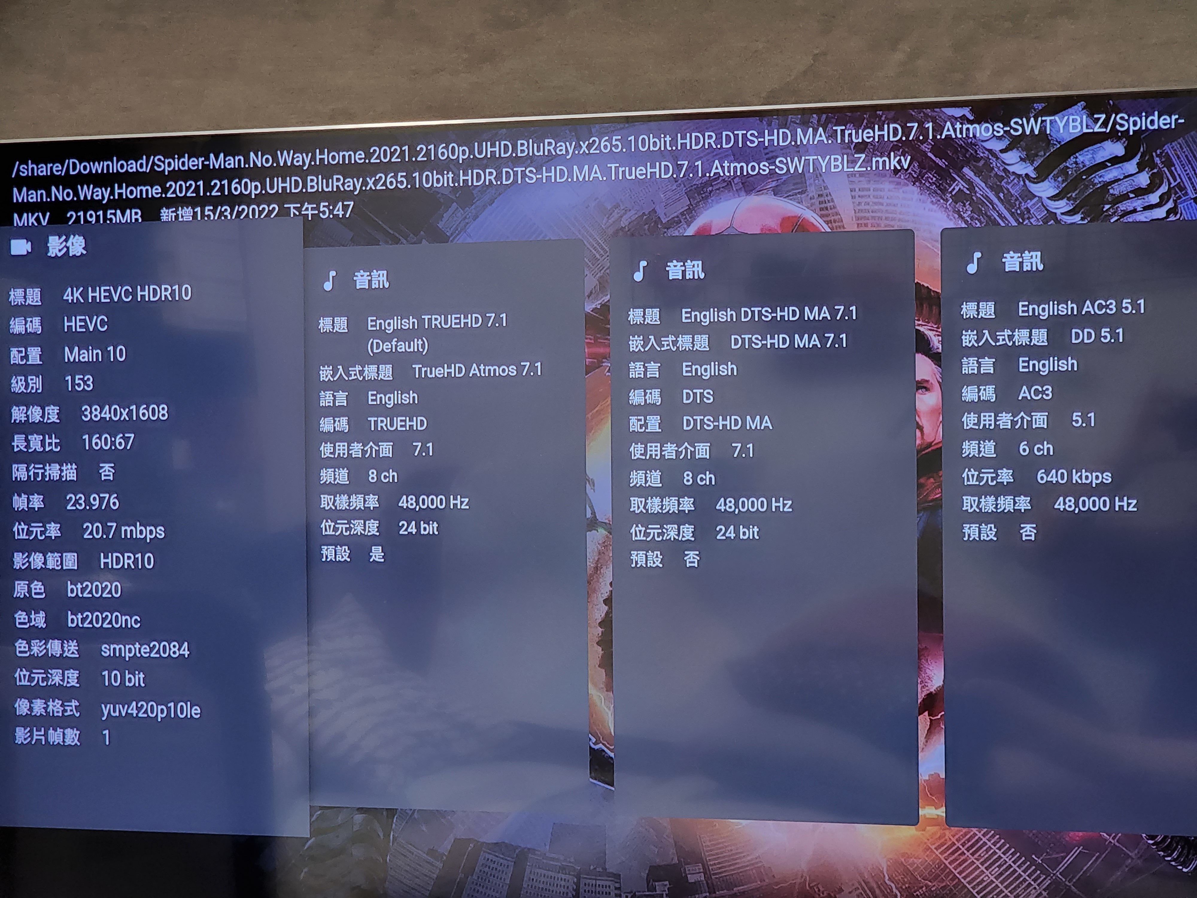 forzalouis 0 Posted May 1, 2022 Author Posted May 1, 2022 59 minutes ago, SamES said: Great that it resolves it. What do you mean by no solution, that is the best solution. Your TV does not support DTS or TRUEHD. That is not an Emby problem, and it's not a problem that Emby or Plex can solve. In either case, the audio must be in a supported format, and it makes no sense to convert it at the server on the fly when you already have a (better quality) version in the file. I do agree though that there may be an issue with the subtitle selection being incorrect in your original post, however it looks like none of the subtitle tracks in your screenshots are english, so what you are seeing does not make sense. Can you please attach a copy of the srt file Spider-Man.No.Way.Home.2021.2160p.UHD.BluRayx265.10bit.HDR.DTS-HD.MA.TrueHD.7.1.Atmos-SWTYBLZ.srt? Thanks Spider-Man.No.Way.Home.2021.2160p.UHD.BluRay.x265.10bit.HDR.DTS-HD.MA.TrueHD.7.1.Atmos-SWTYBLZ.srt