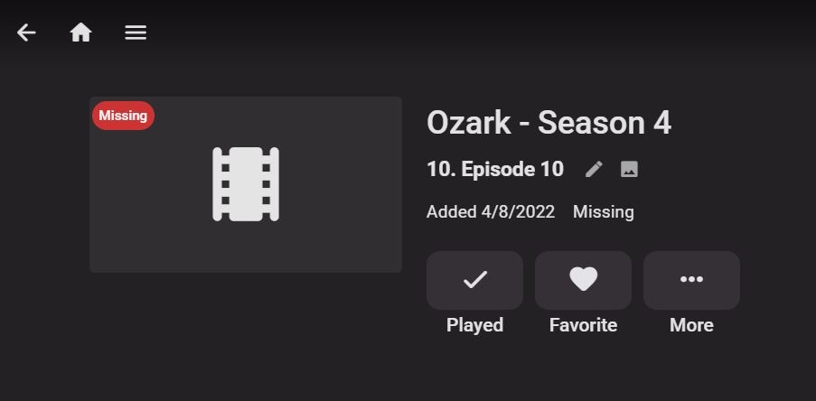 thekingswolf 48 Posted April 29, 2022 Posted April 29, 2022 What up all. Got a weird issue with recently added episodes of Ozark. The files play in VLC fine, they show in recently added episodes in Emby and play fine from there, but they show as missing from the actual show listing, but the episode count on the season poster is right? It's weird. I made a video showing the issue and posted the link below. Things i've done: Rebooted server Rescanned Library Refreshed Metadata Removed folder from library and rescanned, deleting all nfo files, then readding folder and rescanning This happened to me once before but it just kindof fixed itself before I could do any troubleshooting. Server log attached. Video walkthrough of problem https://youtu.be/mOzPhEvohHU embyserver (1).txt