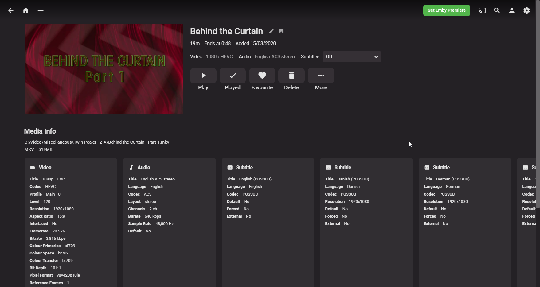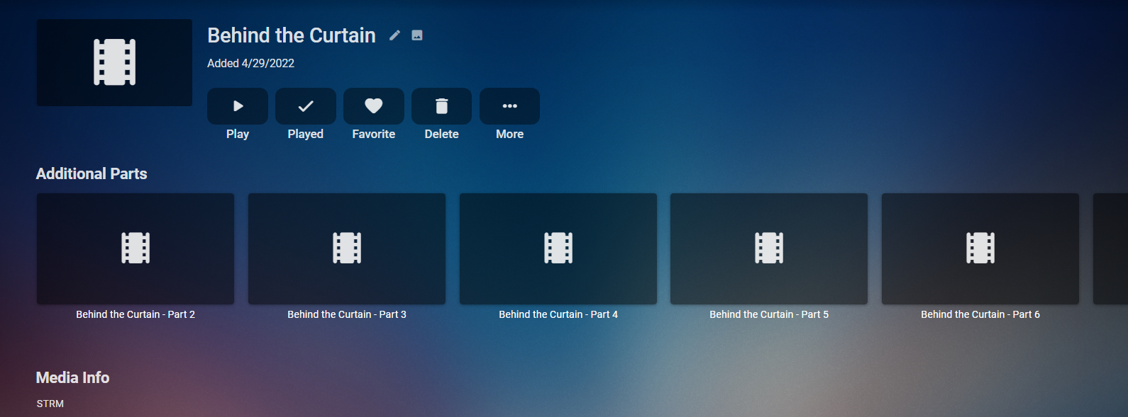 hedgehog90 19 Posted April 29, 2022 Posted April 29, 2022 (edited) I have a sequence of files named 'Behind the Curtain - Part 1' through to 'Behind the Curtain - Part 18' but when I view it in Folder view in Emby, it just shows Part 1. I would expect to see 'Additional parts' at the top of the page, but no matter what I do I can't get it to appear, making Part 2 - 18 completely inaccessible through Emby. Presumably it needs to be in a library with type Movie to show 'additional parts'... but then there's clearly an issue if it refuses to show Parts 2-18 in any other type library. I've tried changing from Mixed Content to Home Videos and Photos. Doesn't help. In a folder with 19 files, this is all I see: I've tried everything besides renaming the files to some crazy naming scheme... because that's not an acceptable solution. Edited April 29, 2022 by hedgehog90