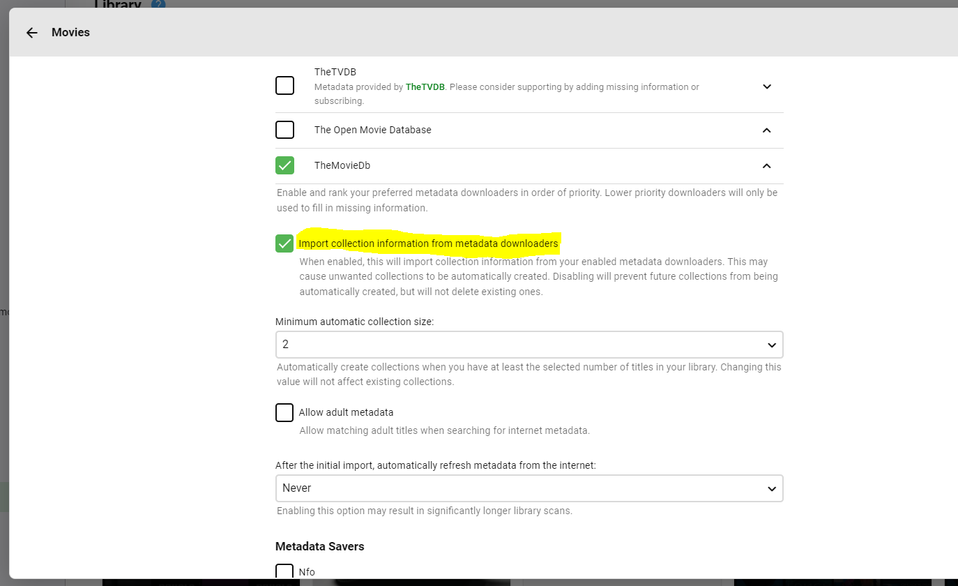 Happy2Play 9782 Posted May 19, 2022 Posted May 19, 2022 2 minutes ago, PeterEr said: 'Some studio' is added when Emby is matching via Imdb, TMDB, thetvdb etc and finally metadata is written to the nfo file. I suppose this is also triggered manually when you do 'Refresh metadata'. It would indeed be great if Emby could be configured to avoid creating collections for certain folders. Emby does not do this, Emby will write a provider collection name (unless you are calling it "Some Studio" but a real example would be better. You can change the specific library options.xml <MinCollectionItems> to say 99 or higher and as I have no idea what how many of these "studio" collection items you have and restart Emby. Then delete the collection and see if it is recreated.