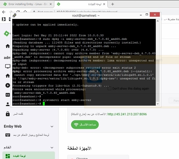 sameh1925 24 Posted May 23, 2022 Author Posted May 23, 2022 When updating the Emby server, this error appears ... The file has been downloaded and placed in the Ubuntu version. Then use this command to install sudo dpkg -i emby-server-deb_4.7.0.60_amd64.deb