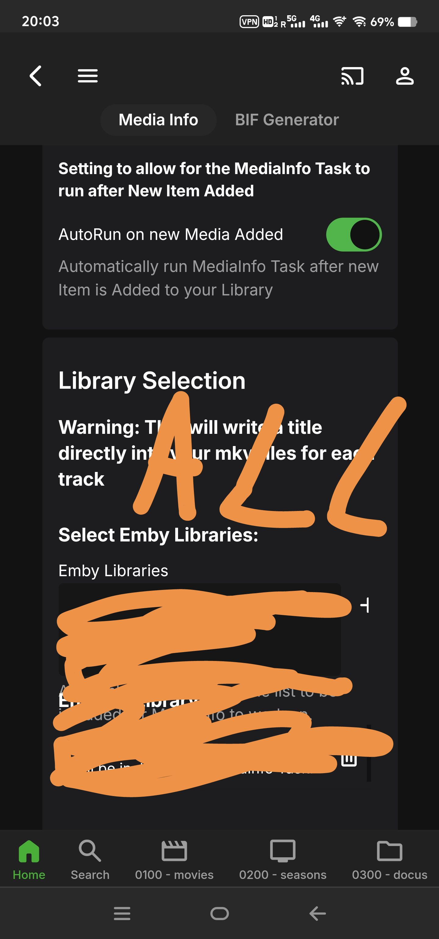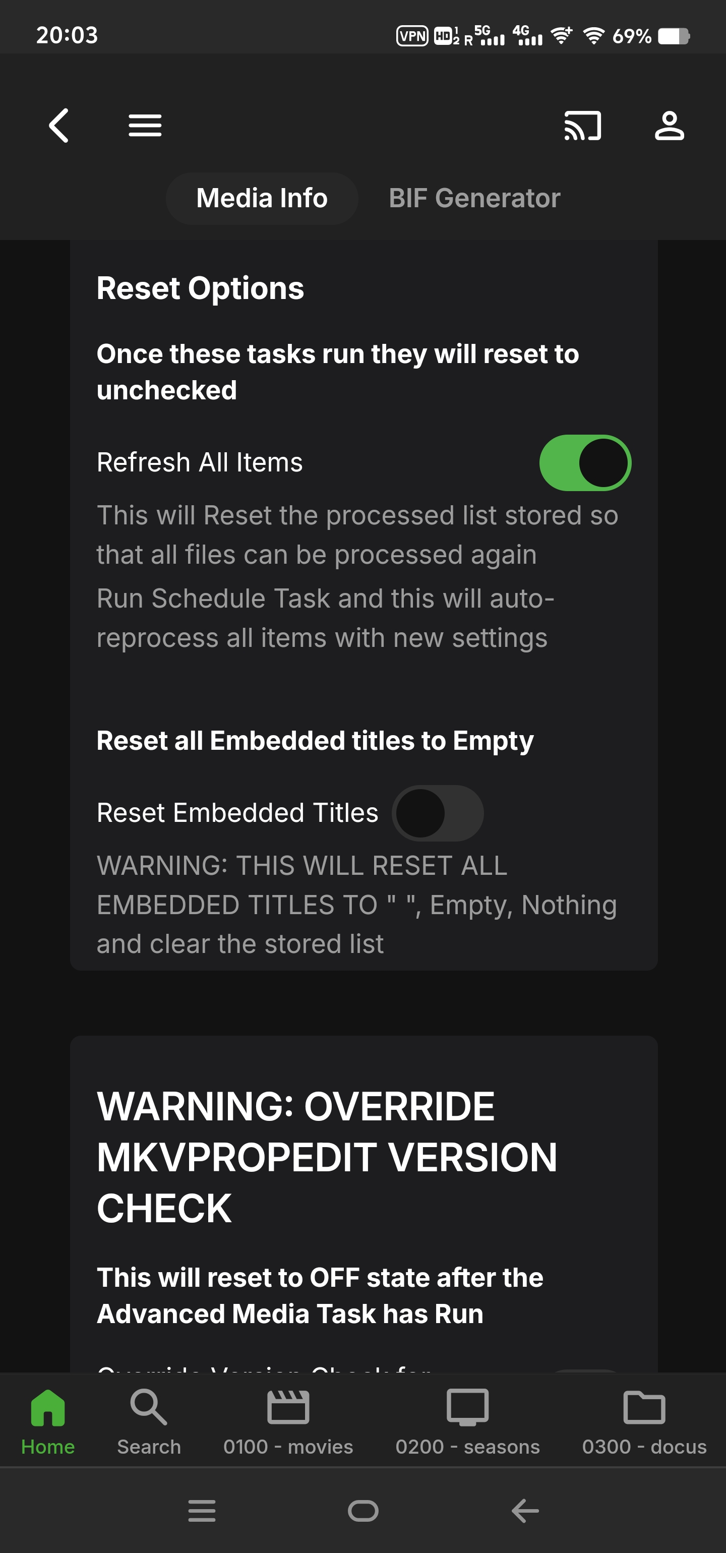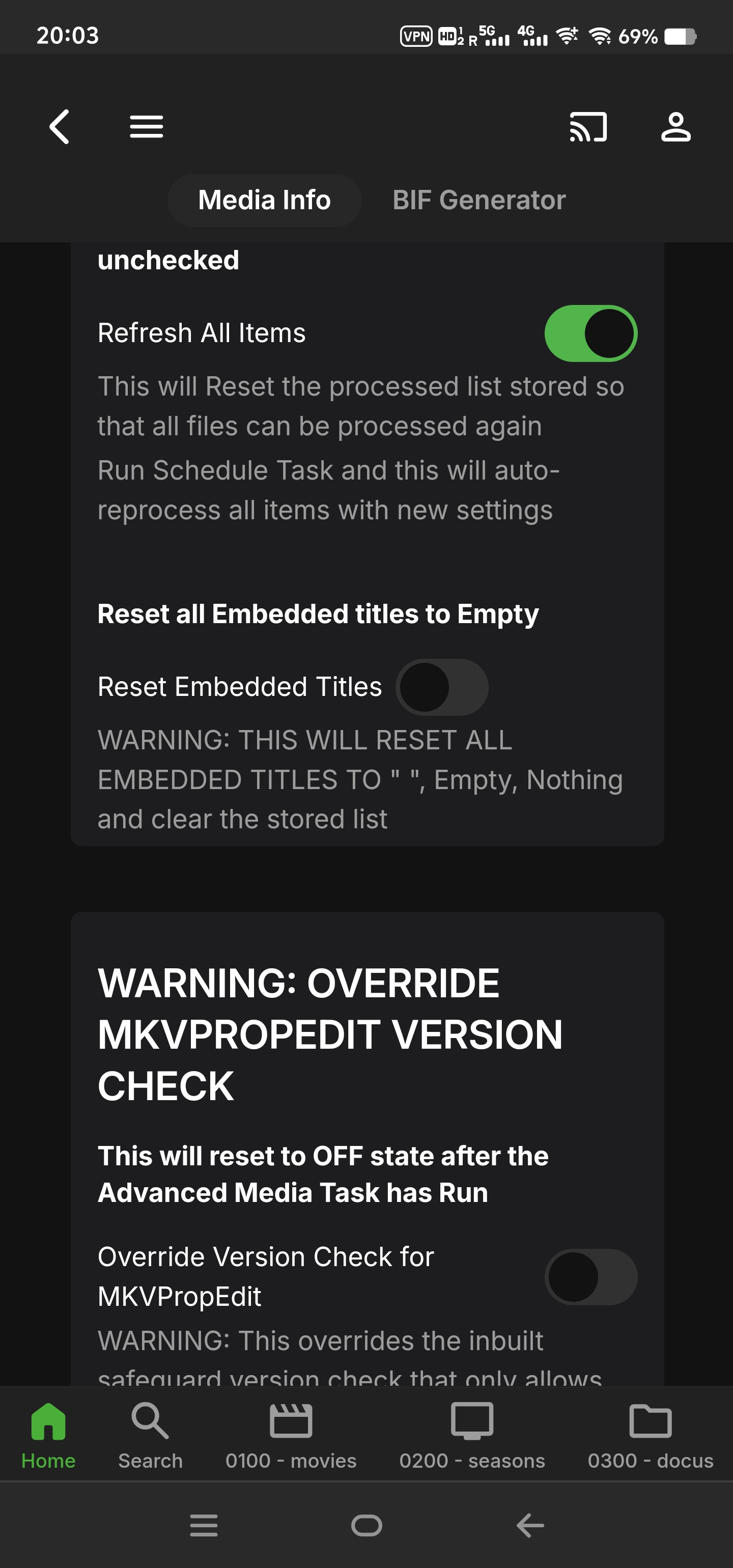 MrLinford 62 Posted May 14, 2024 Posted May 14, 2024 18 minutes ago, supermood said: do you see anything more? is this even a debug log 2024-05-14 19:04:21.819 Info Media Info: MEDIAINFO TASK IS STARTING 2024-05-14 19:04:21.819 Debug Media Info: isEnabled = True 2024-05-14 19:04:21.819 Info Media Info: Performing MKV Version Checks......... 2024-05-14 19:04:21.819 Debug Media Info: MKVPROPEDIT EXE: /bin/mkvpropedit 2024-05-14 19:04:21.881 Info Media Info: MKVPropEdit Process Version: mkvpropedit v70.0.0 ('Caught A Lite Sneeze') 64-bit 2024-05-14 19:04:21.881 Info Media Info: MKVPropEdit Process Version Check Completed with Exit Code: 0 2024-05-14 19:04:21.881 Info Media Info: MKVPROPEDIT VERSION IS 70 - CONGRATS..... THIS VERSION IS SUPPORTED!! 2024-05-14 19:04:21.881 Info Media Info: No. of Libraries selected is 3 2024-05-14 19:04:21.881 Debug Media Info: Internal Library Folder Id = 40731 - Folder Name: 0300 - docus 2024-05-14 19:04:21.881 Debug Media Info: Internal Library Folder Id = 3 - Folder Name: 0100 - movies 2024-05-14 19:04:21.881 Debug Media Info: Internal Library Folder Id = 7152 - Folder Name: 0200 - seasons 2024-05-14 19:04:21.881 Info Media Info: Getting Folder(s) Items 2024-05-14 19:04:21.992 Info Media Info: Total No. of items in Library 4781 2024-05-14 19:04:22.064 Info Media Info: Actual Items to process = 133 2024-05-14 19:04:22.064 Info Media Info: PERFORMING MEDIAINFO EXTRACTION 2024-05-14 19:04:22.119 Info Media Info: MEDIAINFO TITLES Completed for 133 Videos 2024-05-14 19:04:22.119 Debug XmlSerializer: Serializing to file /config/plugins/configurations/Emby.MediaInfo.xml 2024-05-14 19:04:22.121 Info TaskManager: Advanced Media Information Completed after 0 minute(s) and 0 seconds 2024-05-14 19:04:24.900 Debug App: ScheduledTasksWebSocketListener stop transmitting over websocket to 172.17.0.1 2024-05-14 19:04:24.924 Debug Server: http/1.1 GET http://host2:9988/emby/System/Logs/Query?IncludeItemTypes=Log&Fields=BasicSyncInfo,CanDelete,PrimaryImageAspectRatio,ProductionYear,Status,EndDate,CommunityRating,OfficialRating,CriticRating&StartIndex=0&EnableImageTypes=Primary,Backdrop,Thumb&ImageTypeLimit=1&Recursive=true&Limit=30&X-Emby-Client=Emby Web&X-Emby-Device-Name=Chrome Windows&X-Emby-Device-Id=4bd47e49-d1bf-4290-9ce4-d51eb2690086&X-Emby-Client-Version=4.8.6.0&X-Emby-Token=x_secret1_x&X-Emby-Language=en-us. UserAgent: Mozilla/5.0 (Windows NT 10.0; Win64; x64) AppleWebKit/537.36 (KHTML, like Gecko) Chrome/124.0.0.0 Safari/537.36 Edg/124.0.0.0 2024-05-14 19:04:24.925 Debug Server: http/1.1 Response 200 to host1. Time: 1ms. GET http://host2:9988/emby/System/Logs/Query?IncludeItemTypes=Log&Fields=BasicSyncInfo,CanDelete,PrimaryImageAspectRatio,ProductionYear,Status,EndDate,CommunityRating,OfficialRating,CriticRating&StartIndex=0&EnableImageTypes=Primary,Backdrop,Thumb&ImageTypeLimit=1&Recursive=true&Limit=30&X-Emby-Client=Emby Web&X-Emby-Device-Name=Chrome Windows&X-Emby-Device-Id=4bd47e49-d1bf-4290-9ce4-d51eb2690086&X-Emby-Client-Version=4.8.6.0&X-Emby-Token=x_secret1_x&X-Emby-Language=en-us 2024-05-14 19:04:29.187 Debug Server: http/1.1 GET http://host2:9988/emby/System/Logs/embyserver.txt?api_key=x_secret1_x&SetFilename=true. UserAgent: Mozilla/5.0 (Windows NT 10.0; Win64; x64) AppleWebKit/537.36 (KHTML, like Gecko) Chrome/124.0.0.0 Safari/537.36 Edg/124.0.0.0 Do all your files have the correct permissions? Also try the "Refresh All Items" option in the plugin and do a new scan. 1