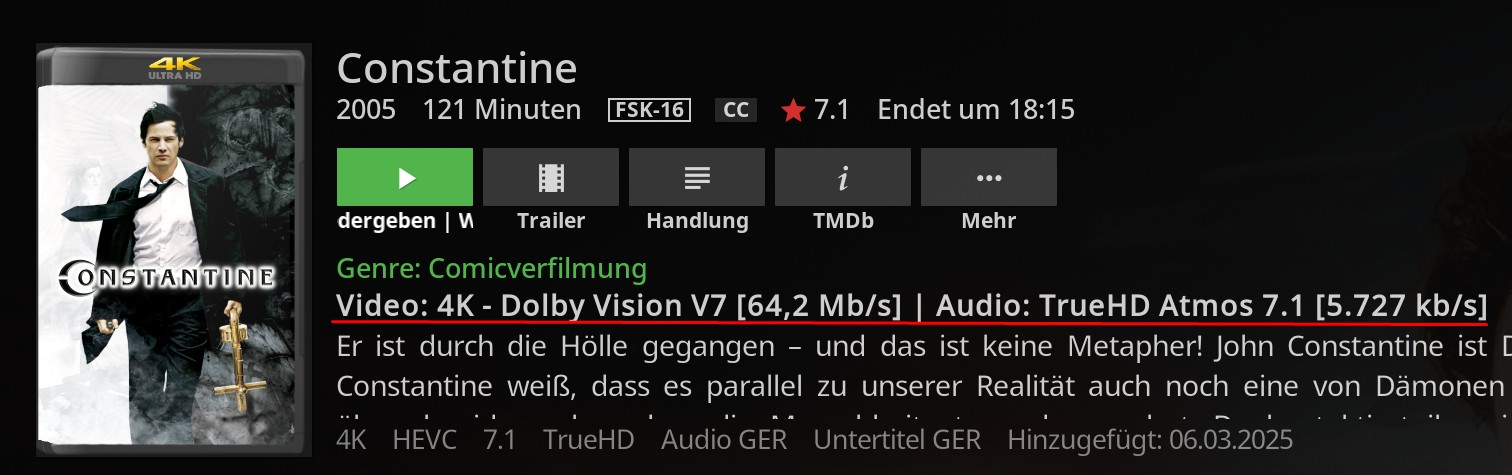 Teddyknuddel 136 Posted March 6, 2025 Posted March 6, 2025 It's a pity that it doesn't go any further here. I started to enter the video and audio information by hand instead of the slogan - it doesn't look too bad: And this is how it looks in Kodi: All in all, this would actually be cross-platform if you were to enter it in the NFO file. So Emby, Kodi, Plex, Jellyfin etc....