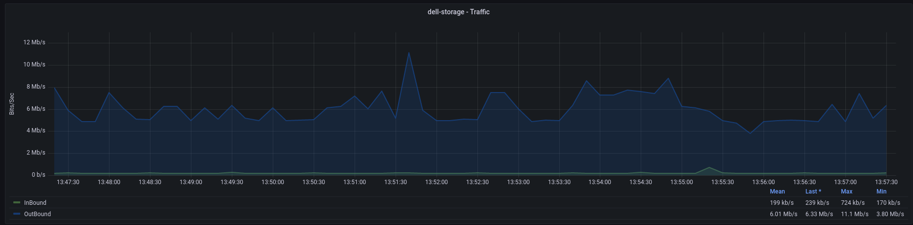 Mickelebof 16 Posted May 31, 2022 Author Posted May 31, 2022 Salut, Oui bien sur, je l'utilise d'ailleurs bien plus quand j'y dépose mes média qu'Emby lui même Exemple lorsque j'y dépose mes medias (graph vert) depuis mon PC également en NFS et en bleu c'est de l'upload vers un autre serveur : Et là, voilà l'utilisation par Emby : D'ailleurs, comme je l'indique, le même volume NFS, depuis une autre VM (même OS) accède parfaitement au volume pendant que la VM Emby n'y parvient plus. Je ne vois pas non plus l'adhérence avec Emby, mais c'est pour le moment la seule chose que j'ai pu constater jusque là. J'ai prévu de passer le serveur en mode debug pour voir mais encore faut il que je sois devant quand ça arrive...