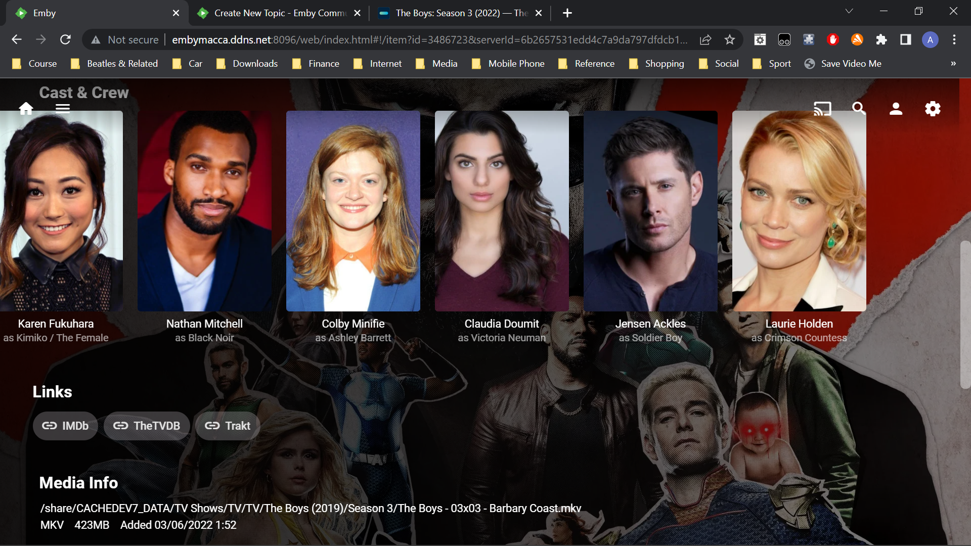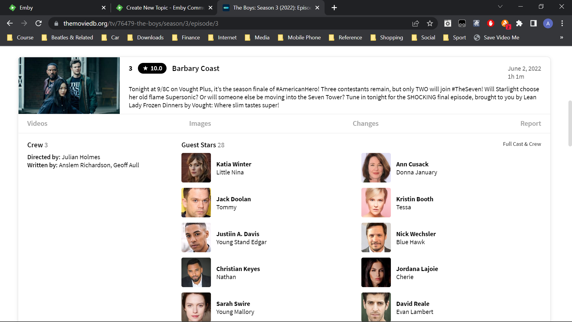 gillmacca01 211 Posted June 3, 2022 Posted June 3, 2022 I have TMDB set as first provider in all option for my TV show library, but when I refresh the metadata, it is only pulling in regular cast, not guest stars at episode level. Example: The Boys (TMDB 76479) season 3 episode 3....have tried refreshing metadata, and removing the episode and re-adding just the video file, so it recreates the nfo TMDB shows the following for guest stars: Don't know if I have set something wrong, a known issue or the api is not able to pull guest stars