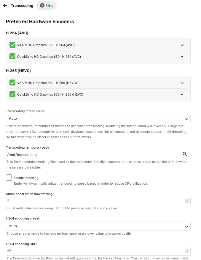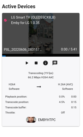 Utini 14 Posted June 7, 2022 Posted June 7, 2022 (edited) Hello everyone, I am using emby-server on Archlinux with emby-cliebt on LG OLED CX TV. I recently recorded some videos with my phone and tries watching them in emby on my TV. I noticed that a playback is very laggy and figured out that for some weird reason it is transcoding the file. I have selected all quality/speed options in the client to "auto". Or should I select the highest possible option? Also, it doesn't seem to use HW Acceleration and I don't know why? Attached are the following screenshots: emby3.png: Detailed info of the video file codec emby1.png and emby2.png showing what it is transcoding and why emby4.png and emby5.png is showing my transcoding options emby6.png shows my hardware Additional Info: The video files are on a 14TB HDD but the temportary transcoding directory is on my SSD. Log file attached as well Thanks in advance! ffmpeg-transcode-bc148b38-2004-4069-8e38-50d9f1621e7d_1.txt Edited June 7, 2022 by Utini