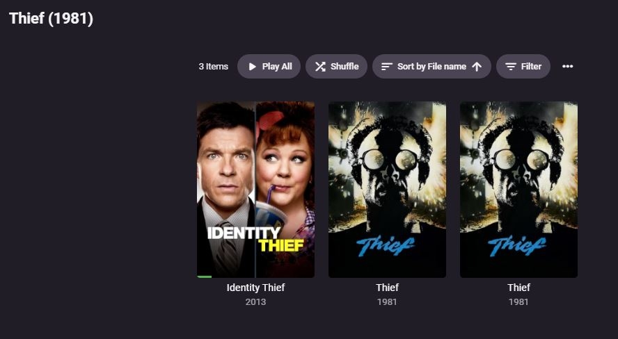 musicmafia 38 Posted June 9, 2022 Author Posted June 9, 2022 (edited) After changing the naming convention, in the "Movies" view, it still shows multiple copies of some movies. Here is an example: I have 3 versions of Thief, but Movies view shows two thumbnails and (after opening) neither displays the dropdown with multiple versions. Any idea what I'm doing wrong on this one? Edited June 9, 2022 by musicmafia