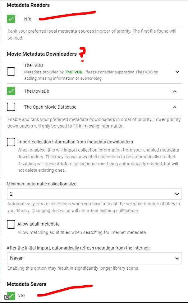 musicmafia 38 Posted June 19, 2022 Posted June 19, 2022 Prior to moving all my media files to a new drive with a different drive path, I read through some threads here which suggested that if "Metadata Readers" and "Metadata Savers" were checked, the process would go smoother. So I checked those boxes prior to migration and the new library location loaded quickly and everything looks right to me. Whew! That process placed .nfo files in all my media folders (which doesn't bother me). I don't really understand any of this stuff but my questions are about optimal settings: Should I just leave everything set this way (using the nfo files method) or should I uncheck and only use this method if I change drives again? Am I still getting data from the database sources or just from the nfo files? Are my "Movie Metadata Downloader" settings and "Image fetcher" settings optimal? (I think these were default settings since I don't know one from the other). If not, any recommended settings or tweaks are appreciated. I am new to streaming but loving it so far. Thanks