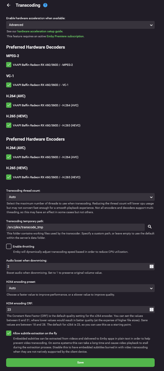 Eriya 4 Posted June 25, 2022 Posted June 25, 2022 (edited) I'm running Emby Server 4.7.2.0 (4.7.4.0 isn't available in the repos yet) on Arch Linux. I mostly use the WebUI. I have seen the tone mapping option in transcoding settings before, but today went to make sure it was configured correctly before trying HDR content for the first time, and it's no longer there. I have Emby Premiere and hardware encoding is enabled. I have been searching all day and haven't found any helpful info. The only thing I can think of that has changed on the system that even *might* contribute to this, since I last saw the option is normal system updates, and changing from ArchLinux's mainline kernel to one maintained by the ArchZFS project, due to the zfs-dkms package not yet supporting the new 5.18.6 kernel. But as far as I'm aware, they use the exact same kernel build configuration as the mainline, except with the ZFS modules included. And as far I could find, HDR-related transcoding stuff is all done entirely in user-space, not kernel-space, anyways? Any help with this is greatly appreciated. embyserver.txt Edited June 25, 2022 by Eriya