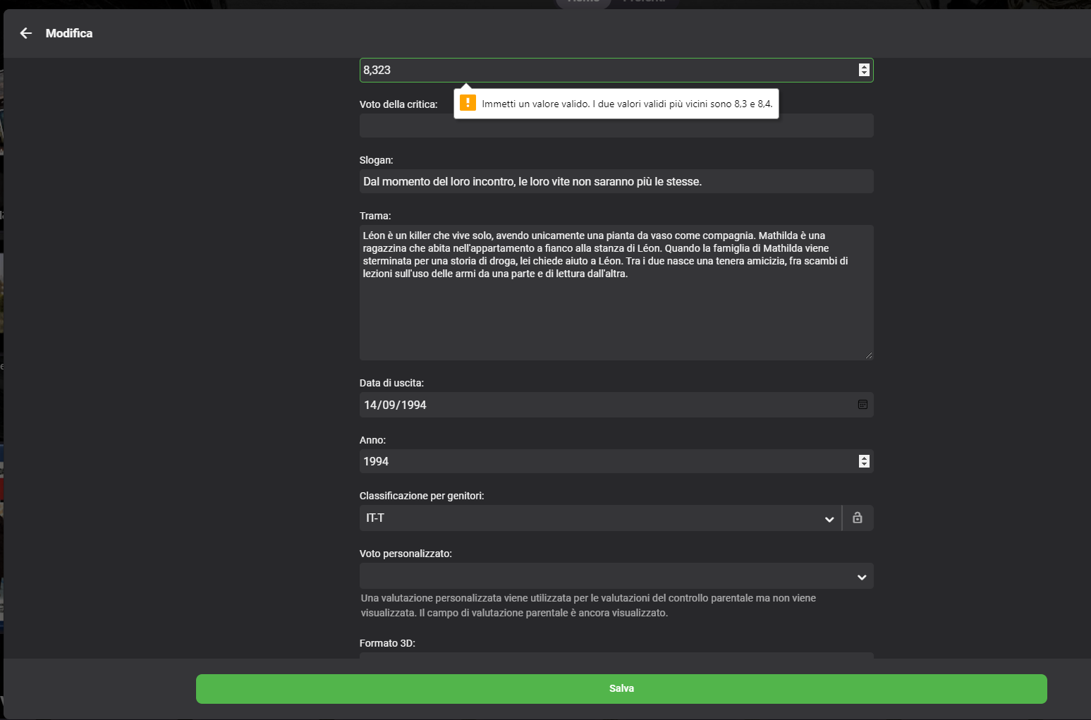 Super957 24 Posted July 26, 2022 Author Posted July 26, 2022 (edited) Another issue with these movies Léon (1994) - IMDb (see nfo buil from Emby) Smetto quando voglio (2014) - IMDb To solve as other times I change the rating value and save Thank Hispa Leon (1994).nfo Edited July 26, 2022 by Super957