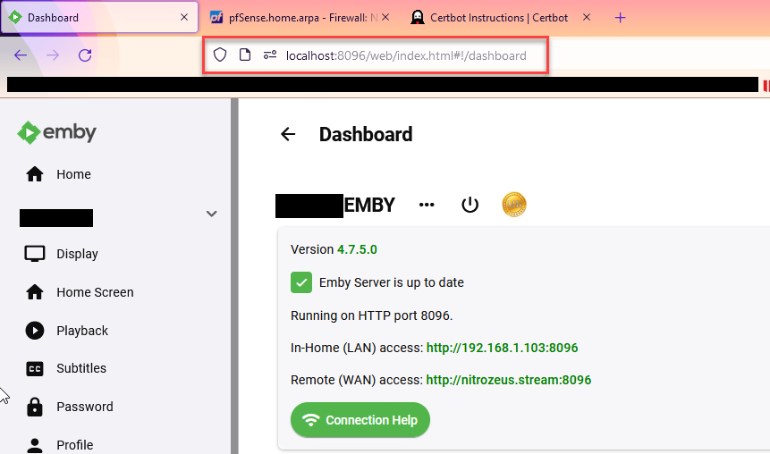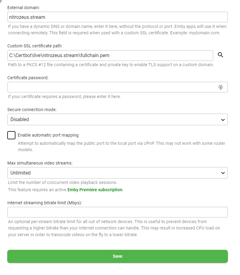 Nitro_Zeus 11 Posted July 11, 2022 Posted July 11, 2022 Hey Guyes, I have installed Emby with default settings. ran Certbot to get a Certificate to nitrozeus.stream I followed this guide: https://certbot.eff.org/instructions?ws=other&os=windows And the cert setup was success See picture Emby 03.png and picture Emby 02.png I have not changed any settings in netowork besides adding my domain nitrozeus.stream. and somehow the WAN wont update, and i cannot access the site https://nitrozeus.stream I tried to define the path "Custom SSL certificate path" to where the "fullchain.pem" file is, wich works fine, but still nothing works, what am i doing wrong