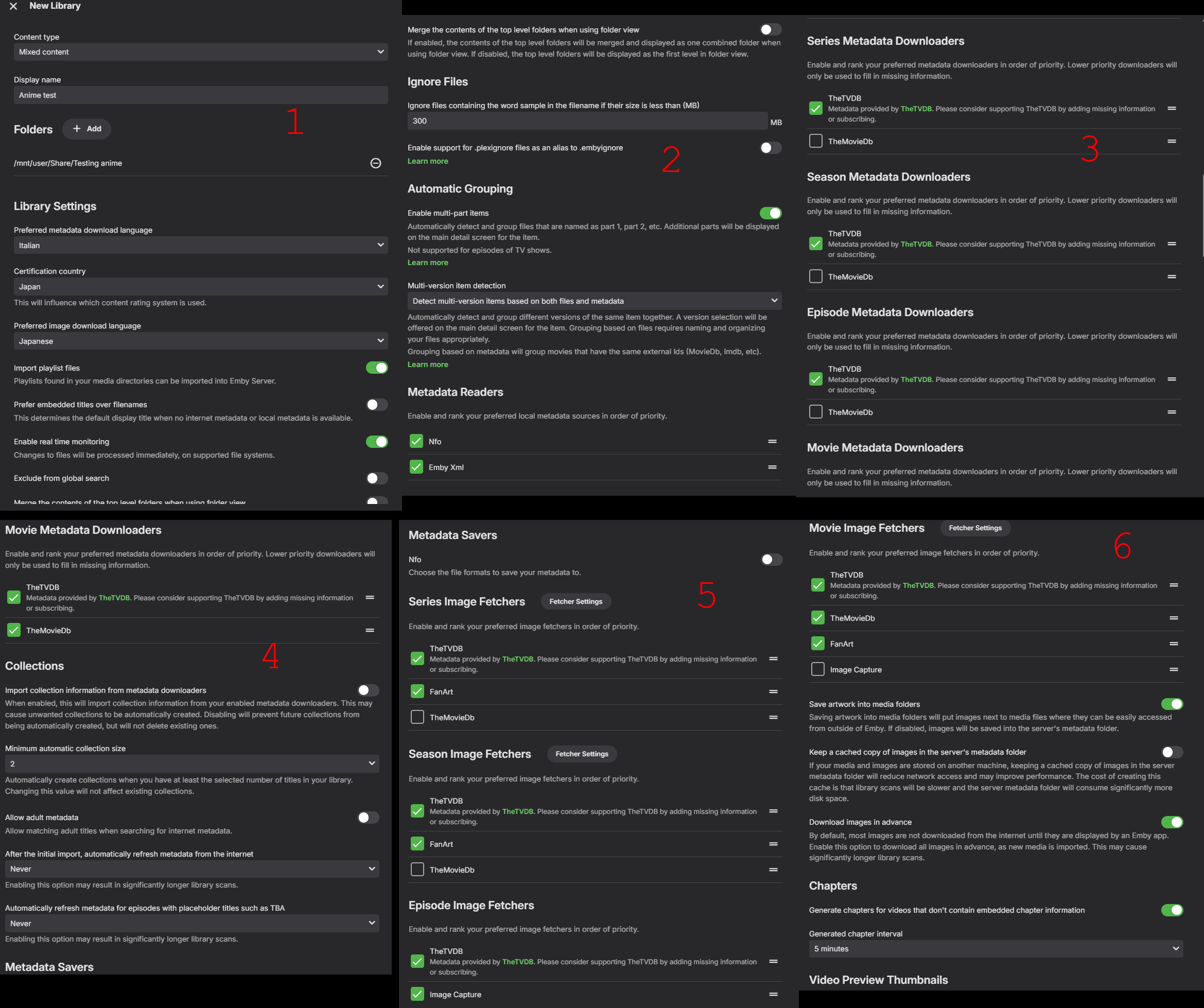 lostman_ 1 Posted December 27, 2025 Posted December 27, 2025 Little update. Before adding my all library to Emby, i decided to do some experiment, to see both how Emby and TVDB manage the different folding structure and naming scheme there are on my library. To be precise, main folder contain both anime and animated film with a folder each one, with name and year, that's basic naming scheme for everything, almost. Anime/ Planetes (2003) Plastic Memories (2015) Pluto (2023) Pokemon (1997) Porco Rosso (1992) So level 1 folders are oke, the issue start with level 2 and 3 and can be easy like this one (most anime have a "SeasonXX" folder, even the one with just one season, apart for movie stuff. Taking into consideration that sometimes i have other stuff in those folders, like DVD covers, PDF or JPG media for collection, specific music, etc) : Anime/ Bakuman (2010)/ Season01 Season02 Season03 Or more complicated like this one: Anime/ Kono Subarashii Sekai ni Shukufuku wo! (2016) Movie/ Kono Subarashii Sekai ni Shukufuku wo! Kurenai Densetsu (2019) OVA/ (2 files without folder) Season01 Season02 Season03 There are even worse ones. So, i took some of those more complicated and some easy one and put on a temporally folder on my cache, and try making a library with just a few GB of stuff. I select those for my testing, but i would maybe try other, depending on the result. I already know that when i would scan the all library, i would surely need to look at each anime and see if everything is ok, anyway. First one is Orange Road with this folder structure: Orange Road (1987)/ Extra/ (mix of video, opening, art work, music, etc, divided in other folders) Movie/ (3 movie without folder, i want to see if is better having a folder for each one or none) OVA/ (8 OVA) Season01/ (regular 48 episodes) Special/ (one special like OAD) Then Initial D, just because there is a extra folder with all the extra stage, just some specials. Initial D (1998)/ Extra/ Initial D Battle Stage Initial D Extra Stage Initial D Final Stage Initial D Legend BD-Rip (a .rar with OST) Season01 Season02 Season03 (it's a film, a want to see of it display it) Season04 Season05 Then i'm trying one that on each Season folder have some OAV or special, not sorted, or even folder for extra stuff. Grisaia no Kajitsu (2014)/ Season01/ Extra (a ton of stuff, from art, soundtrack and mini videos) (normal episodes) (6 Specials) Season02/ Extra (like the one on the folder above) (a Movie and a special) Season03/ (same ad the first folder, mix of Extra folder, episodes and special) Last, i want to see how multiple version of the same stuff are handled, nothing particular, in this situation i just have 2 folder for season 1 and two for season 3, where one is a normal version and the other one have Italian subtitles but is an older release. Aria the Animation (2005)/ Season01 - Aria the Animation Season01 - Aria the Animation - ITA Season02 - Aria the Natural Season03 - Aria the Origination Season03 - Aria the Origination - ITA Season04 - Aria the Avvenire To make the library on Emby, i'm trying with "mix content" considering there are movie and series. Below images on how i setup the library, i'm Italian so i would love to have text and description in Italian, even so i much prefer Anime title in original Japanese or eventually English, so i need to see how things behave and eventually i would use English, as for images and rating, the original ones is fine. So we got the result. - Starting from Aria, season 1 and 3 have two different variant, how Emby show me those? Opening the anime i just see the 4 seasons (the 4th doesn't have the right name, it's just named season 4), but if i select season 1 or 3, and i select a episode, without using the play button, it show me the Version tab! But if for example i select a different version, the episode finished, next one hit, the next one doesn't follow the same version and use the first one available. So, not a good solution. Plus, on the season 3 folder there are some special and it show me those as different version of the tab, when those are totally different stuff. Before moving them on a different folder, i want to see if changing language of the metadata, would help. - On Grisaia i just see the 3 season (season 3 have a generic name, could be a language issue); on season 1 there is no music or art, but other than the season itself, there are all the specials and the ending of the specials, those are on a specific folder inside the extra folder. No bueno, i need to move or remove them. On season 2 same, i see the movie, the special on the same folder and the credit on the extra folder. On season 3 is the same of the season 1 folder, a mix. No bueno. Before doing change, i would try with a different language on metadata, here too, and then maybe try arranging folders in a different way. - As for Initial D, seems like Emby doesn't like series with more than 3 season, lol, season 1 and 2 are so perfect that the metadata pick even each episode name in my language, from season 3 up they all have the file naming, and doesn't make sense, because all seasons have the same nomenclature. Still, need to see the difference with different language metadata. As for the Extra folder, i see a Extra season, but inside is everything together, no division from the folders, so i probably need to make a folder for each special, beside the season folder, i would try. - As for Orange Road, it fuck up badly, Emby just make one big Season 1 with everything in it, everything from the many folders you can see above. Before doing any change to the folder design, i would try changing language of metadata, as mentioned above. So, for now, i know that Emby see the Extra folder just when it like to do, it could be a naming scheme issue. We know that stuff inside the folders need to be very good separated, otherwise it is a mess. Now i would try adding another anime, one well sorted that still have other folder, like OAV or Spec