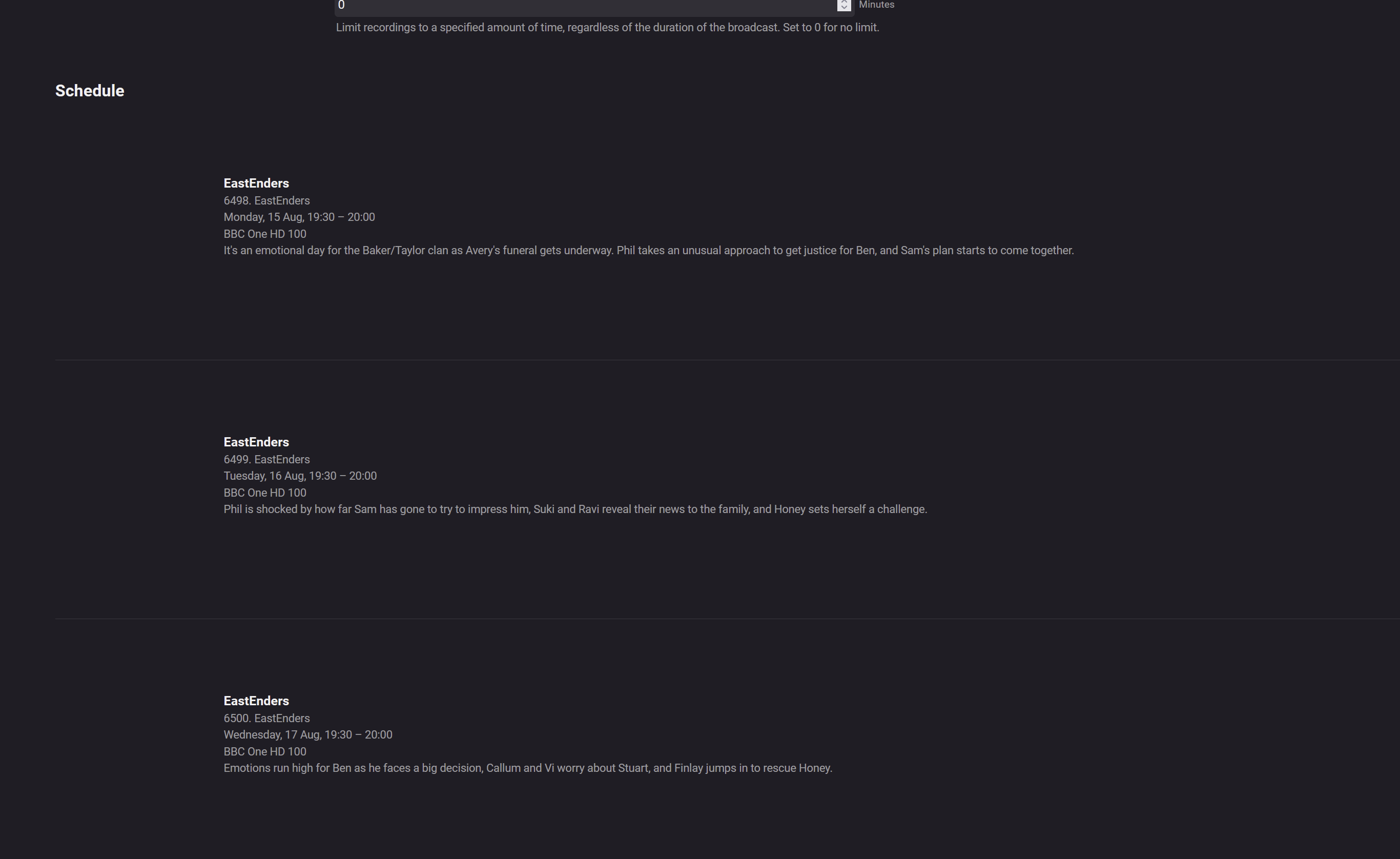 Luke 42085 Posted August 12, 2022 Posted August 12, 2022 Are you sure it did at the time, because this is how the recording saved: 2022-08-11 19:27:12.433 Info LiveTV: Will record to E:\Recorded TV Series\EastEnders\EastEnders 2022_08_11_19_30_00 - EastEnders.ts If there were numbers it would have been using season and episode numbers instead of a date in the file name. Anyway I can see the issue in your case. When the title of the episodes are the same, the server thinks they are the same episode. Easy fix is we won't do this comparison when the episode title is the same as the series title.