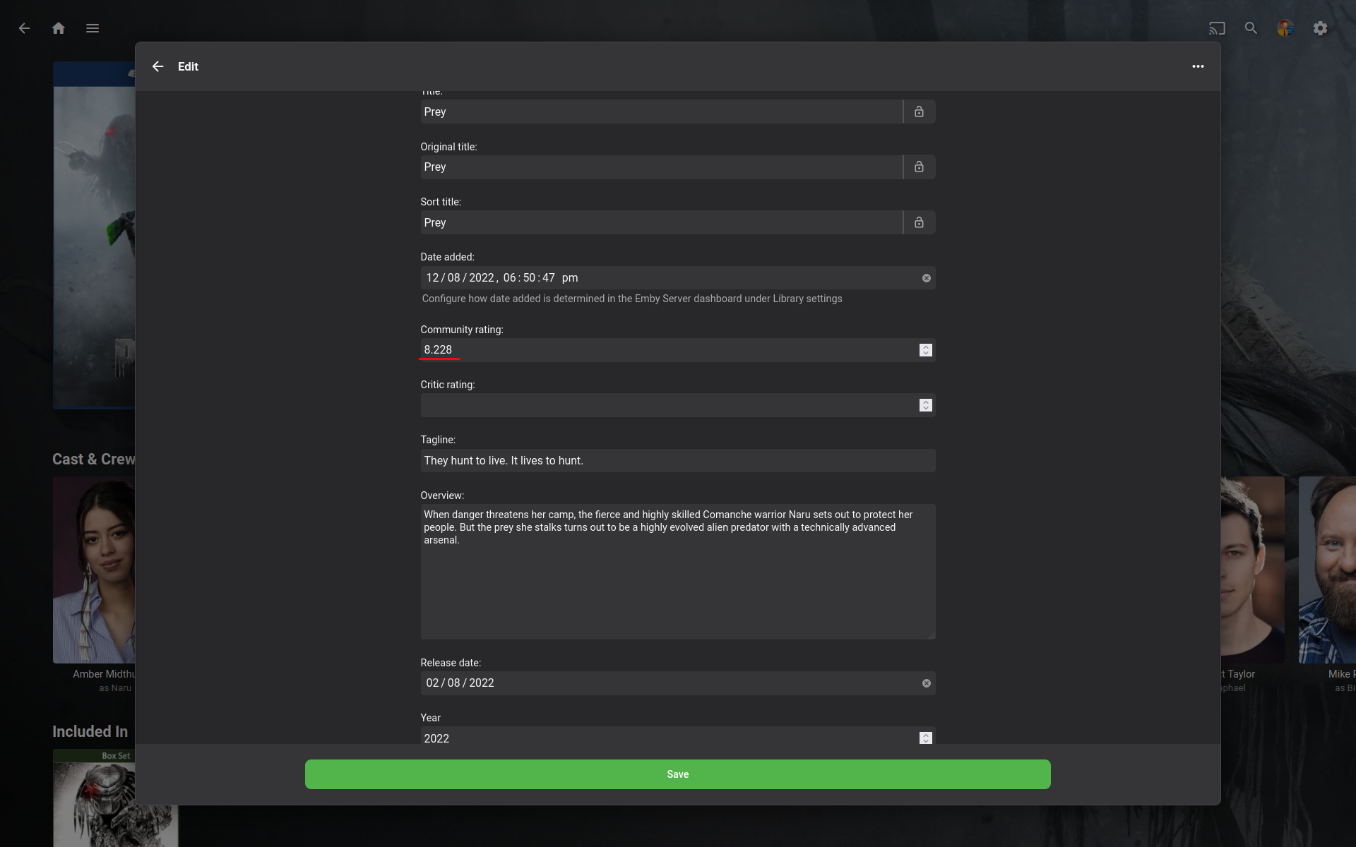 gjames50 7 Posted August 11, 2022 Posted August 11, 2022 (edited) I'm having some strange behavior with some metadata after new media is added. Occasionally the community ratings will have 100ths and 1000ths. It displays correctly however when I go to edit save the metadata (changing some other setting/parameter) I get the error "Please enter a valid value. The two nearest valid values are X.X and X.X". This is annoying as I then have to manually change the community rating to a tenths value then save. I don't ever remember running into to this before. Can Emby just automatically round these values so I don't have to manually do this? This only is an issue when I have to edit a particular piece of media that has a rating beyond the tenths. See screenshot for example. Thank you. Edited August 11, 2022 by gjames50
