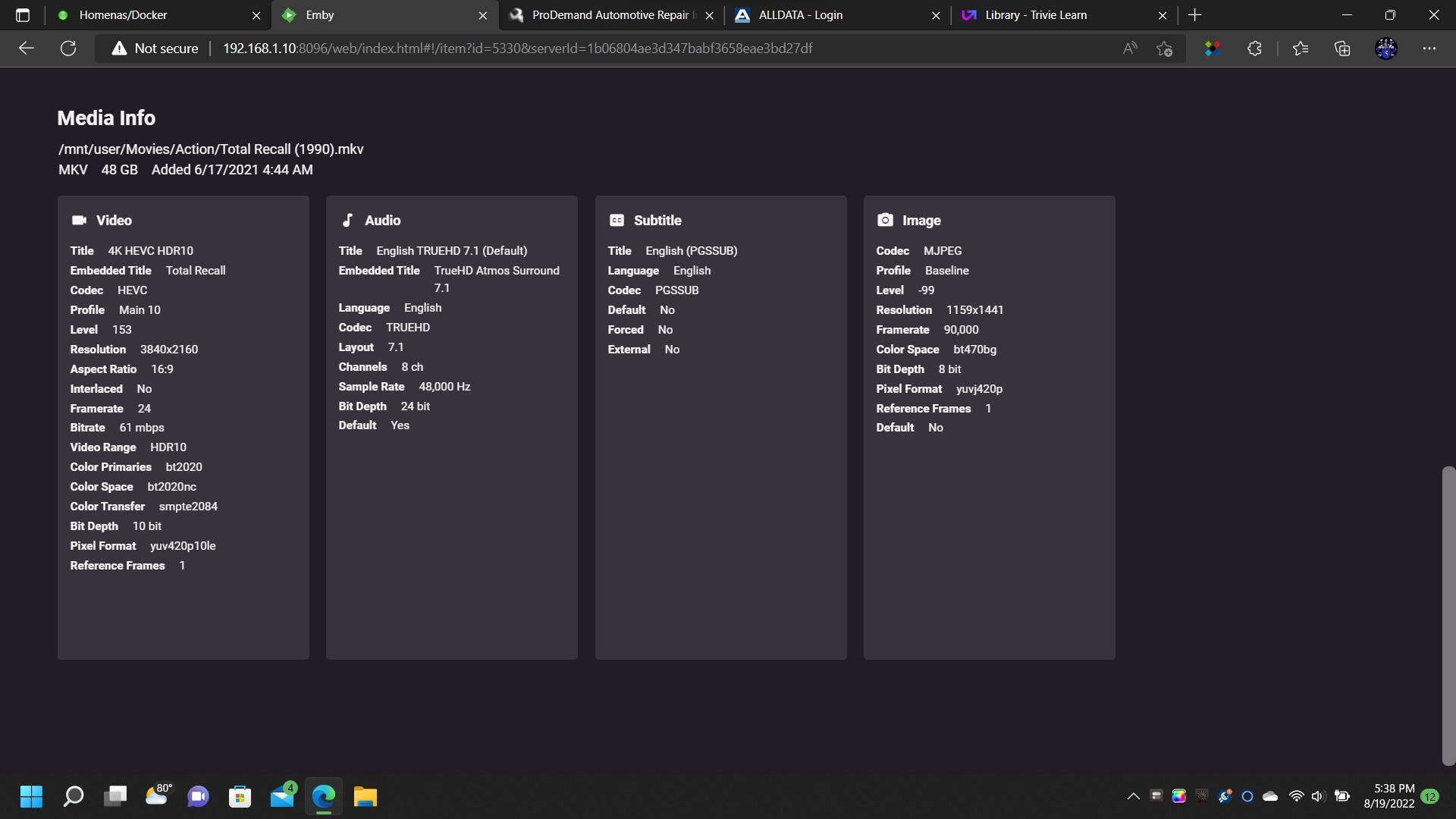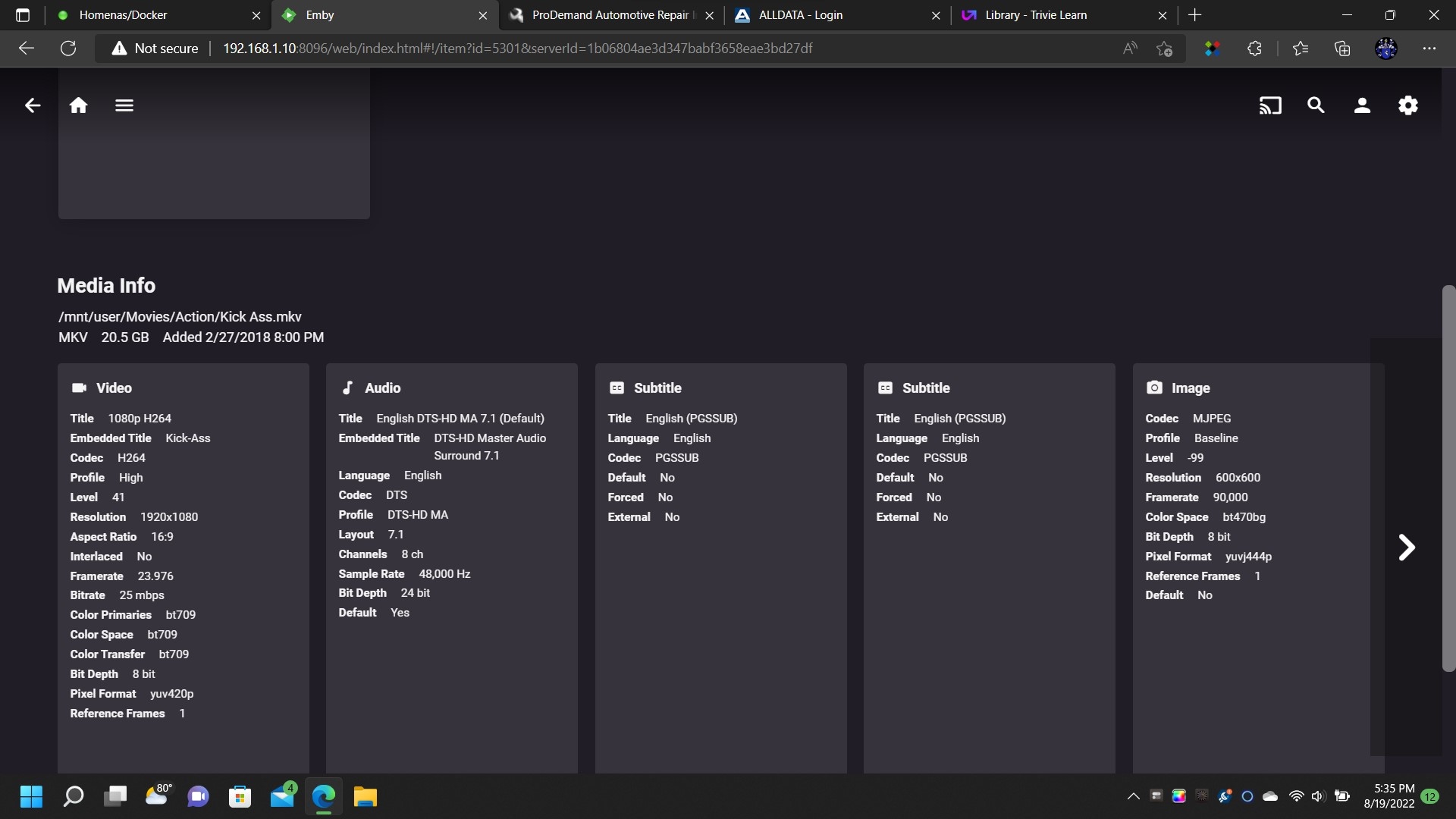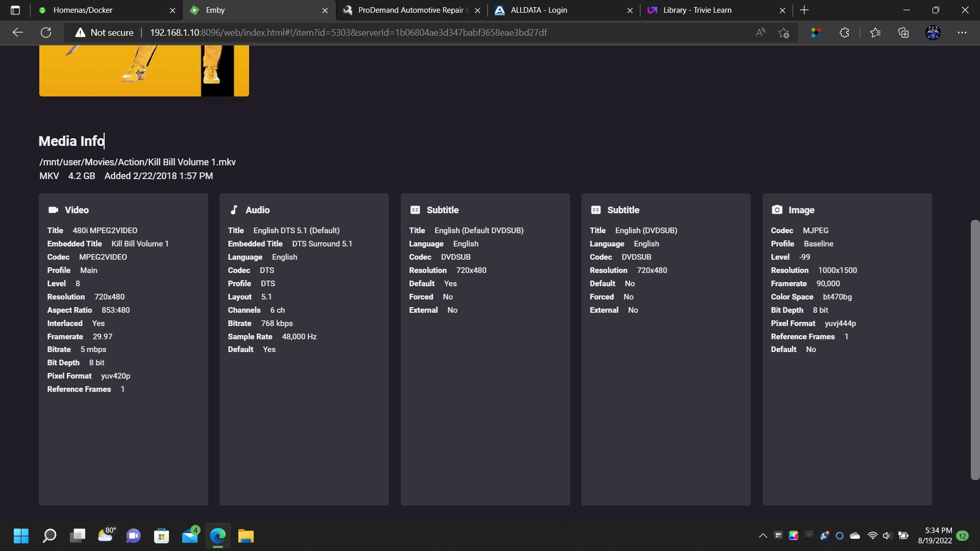 I was preparing a 10 sec MKV video clip for you last night and embedded a cover image.  Before I uploaded it, I decided to test it on the server.  The cover showed up.  I even deleted the image in Emby and had it re-search for meta data and it pull the cover again.  The last 4 movies I have added it did not work plus now lots of old ones that were showing an image are not now after a metadata replacement.  I am wondering if something is corrupted on my end.  I tired uninstalling the Emby docker but that did not help.  I removed Emby again and found and deleted the entire embyserver folder that stores the cache and settings.  I will try and get it all re-setup tonight and report back.