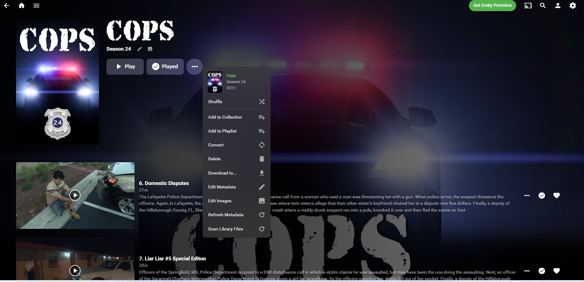 marklyn 0 Posted August 21, 2022 Posted August 21, 2022 Plex user here but I just discovered Emby and really am liking it so far except for two issues I cannot find solutions for. 1) After watching a show, I return the the screen with the show and the options listed (see attached). One of them is to delete, what I assumed was the show, but it actually deletes my entire subfolder and all shows! I tried this twice (after restoring the folder and subfolders from a backup). Also attached the folder/subfolder structure. What am I doing wrong? The first photo shows when I had just watched S24E04 and chose to delete. The message does say "deleting these items", which made me suspicious but I proceeded and it deleted all folders starting with, and including, the COPS folder two levels above the folder this show was in. This deleted the higher level COPS folder and all Season 22 through Season 33 subfolders which are immediately under the COPS folder! (see 2nd attachment for folder structure) Is this a glitch and, if so, should I report it? 2) The second issue is that if I play just a few seconds of an episode, say 5 seconds, why does EMBY then think it's been viewed and will prompt to play the next episode. Again, using the first screen shot as the example. If I press play S24E5 and stop it after 5 seconds it will return to this screen and then it will show "Play S24E6" now. Again is this a bug or setting somewhere I missed. I think it only happens on this screen there it moved the episode counter up for just a few seconds of run time.